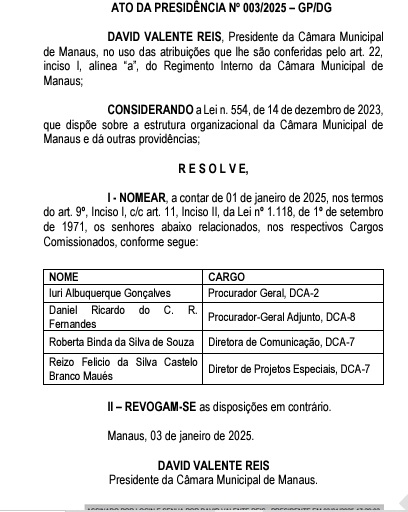Manaus – Nesta sexta-feira (3), o ex-vereador Reizo Castelo Branco foi oficialmente nomeado como Diretor de Projetos Especiais da Câmara Municipal de Manaus (CMM). A nomeação foi publicada no Diário Oficial da Casa Legislativa, consolidando sua entrada em um dos cargos mais estratégicos da instituição.