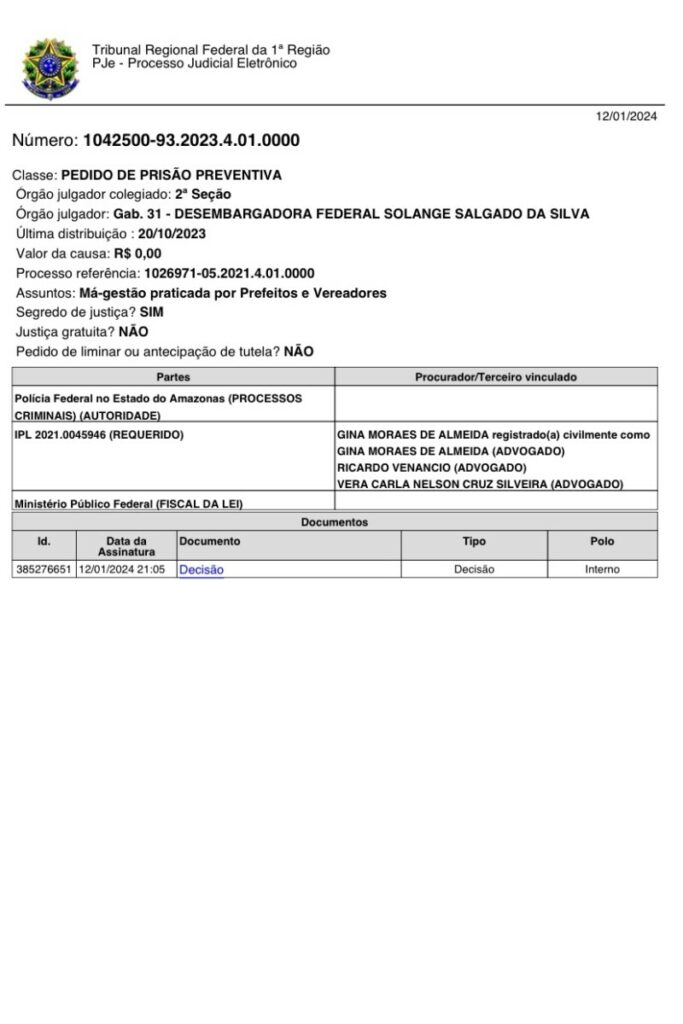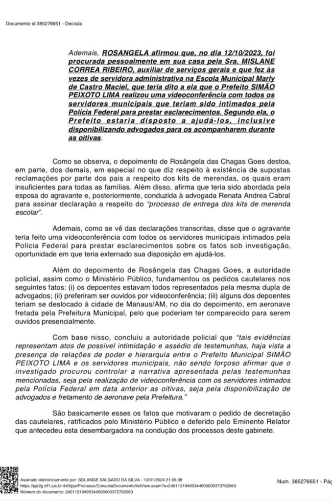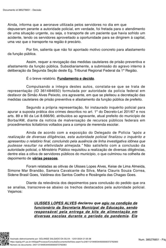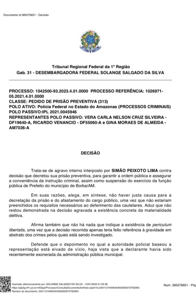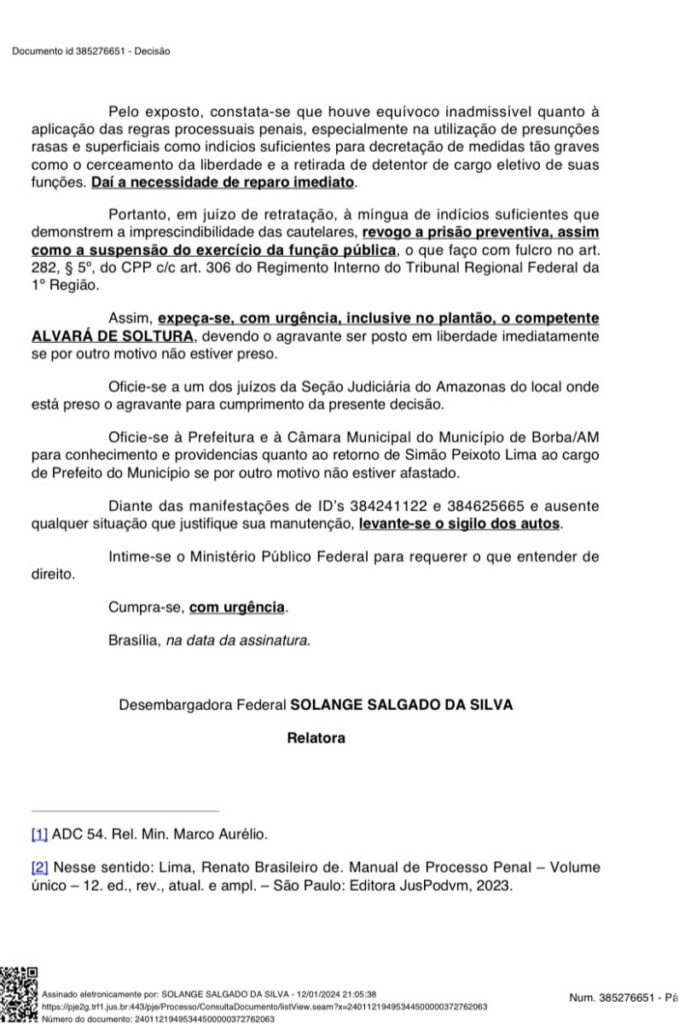 Amazonas – A desembargadora federal Solange Salgado da Silva, do Tribunal Regional Federal da 1ª Região (TRF-1), revogou a prisão preventiva e o afastamento do cargo do prefeito de Borba, Simão Peixoto, que havia sido alvo da Operação ‘Voz do Poder’ da Polícia Federal.