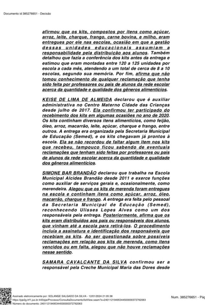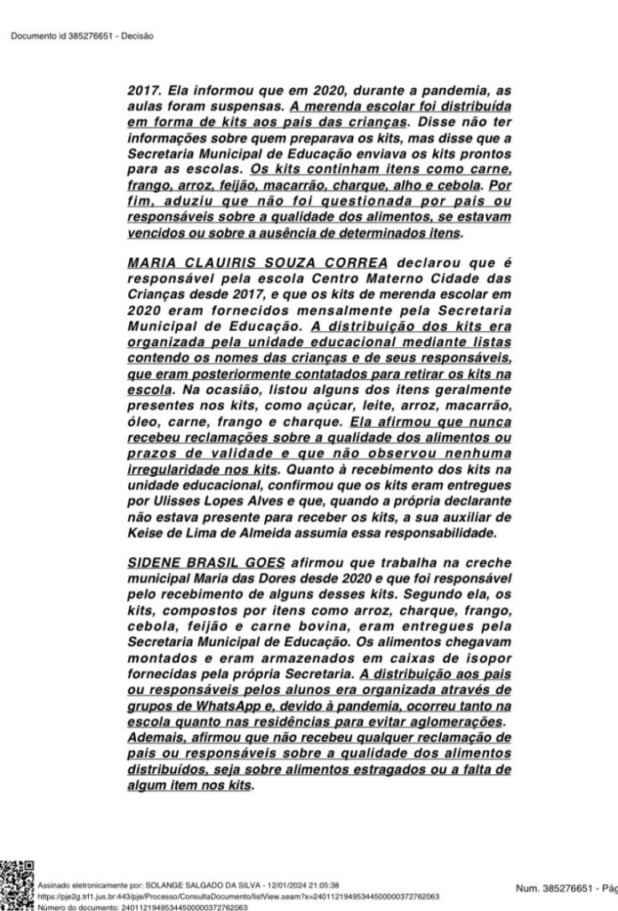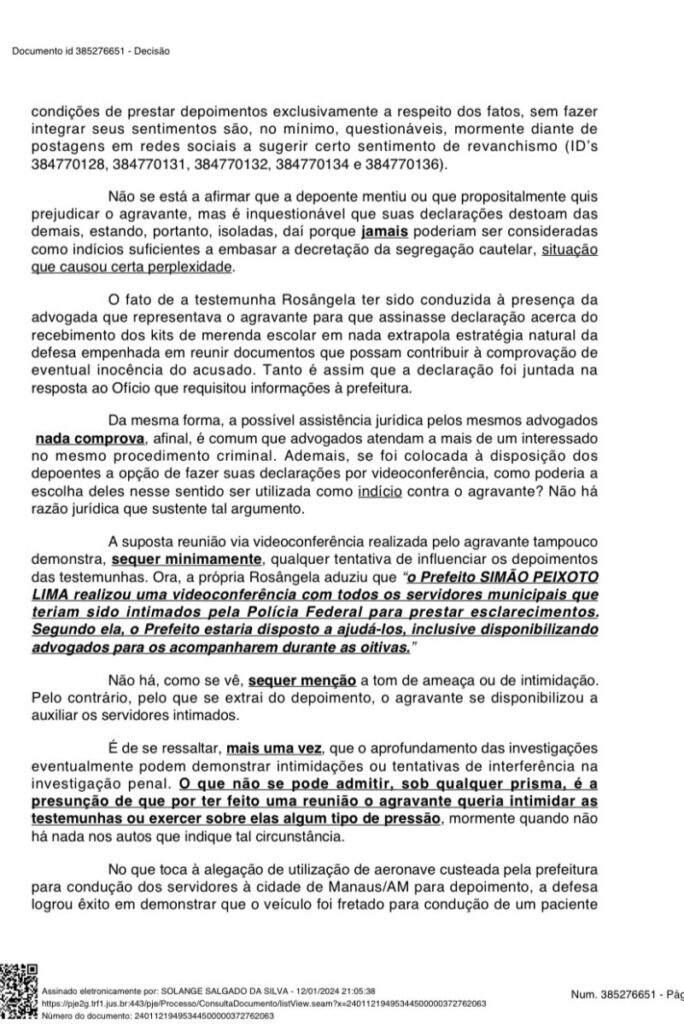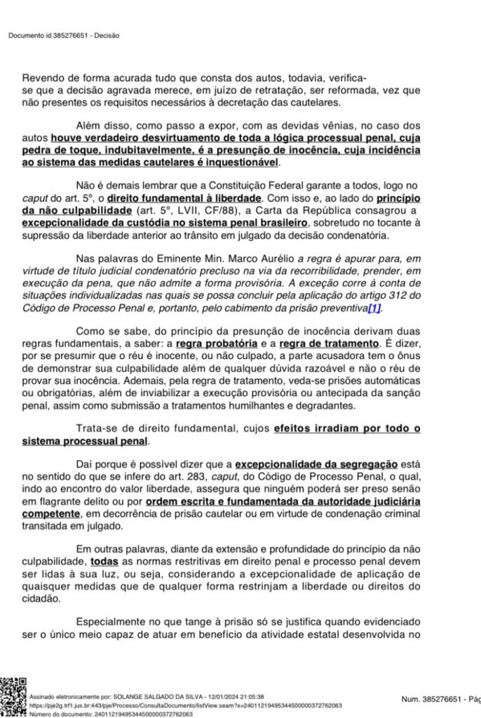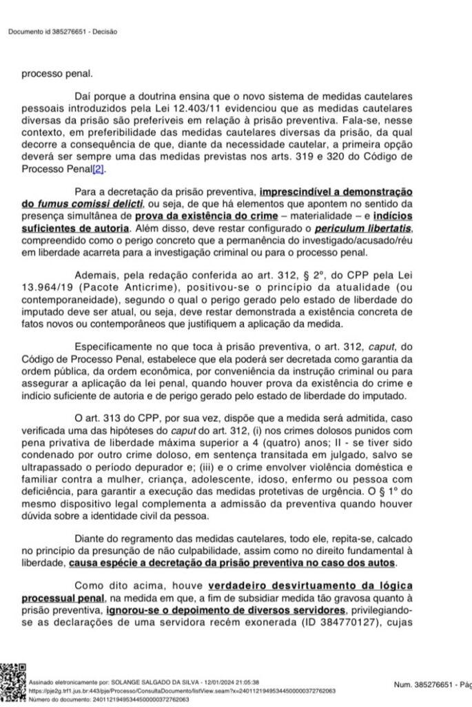 A nova decisão destaca a falta de elementos que justifiquem as medidas, ressaltando que as declarações da servidora Rosângela das Chagas Goes, base para a prisão, estavam isoladas e sugeriam sentimentos de revanchismo.