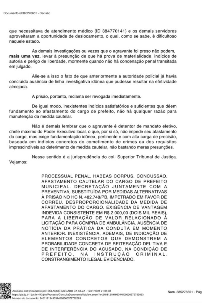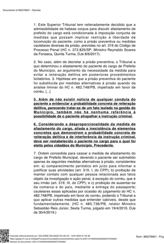 A desembargadora Salgado da Silva também argumentou que não há indícios concretos de interferência nas investigações ou risco à aplicação da lei penal por parte do prefeito. Quanto ao afastamento do cargo, a magistrada enfatizou a ausência de elementos que demonstrem probabilidade concreta de reiteração delitiva ou interferência na instrução criminal.