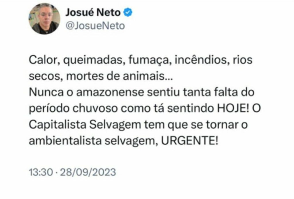 “Nunca o amazonense sentiu tanta falta do período chuvoso como tá sentindo hoje! o capitalismo selvagem tem que tornar o ambientalista selvagem,URGENTE” disse em tom de advertência
