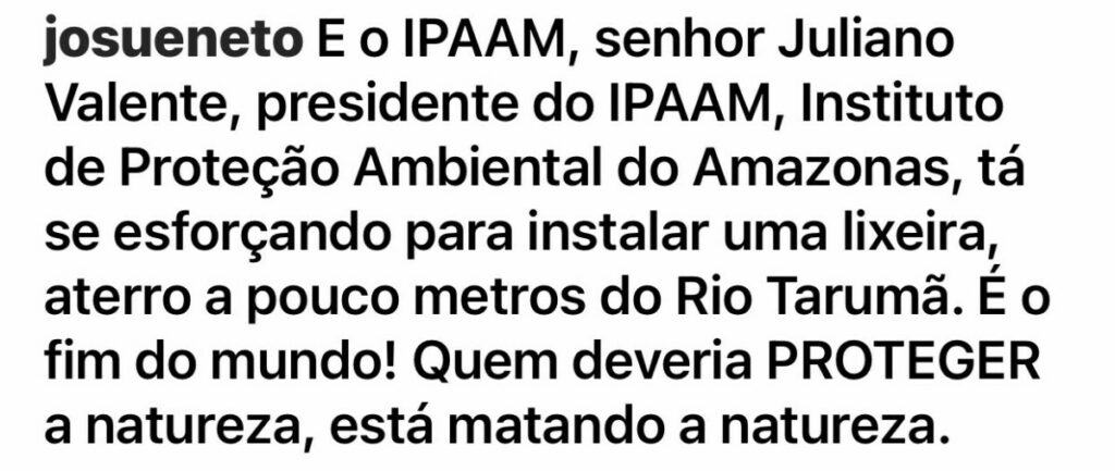 Manaus – O conselheiro do Tribunal de Contas do Estado do Amazonas (TCE-AM) Josué Neto usou suas redes sociais na tarde desta quinta-feira (28), para criticar o presidente do Instituto de Proteção Ambiental do Amazonas (IPAAM), Juliano Valente sobre uma possivel instalação de uma lixeira aterro a poucos metros do rio Tarumã e disse;