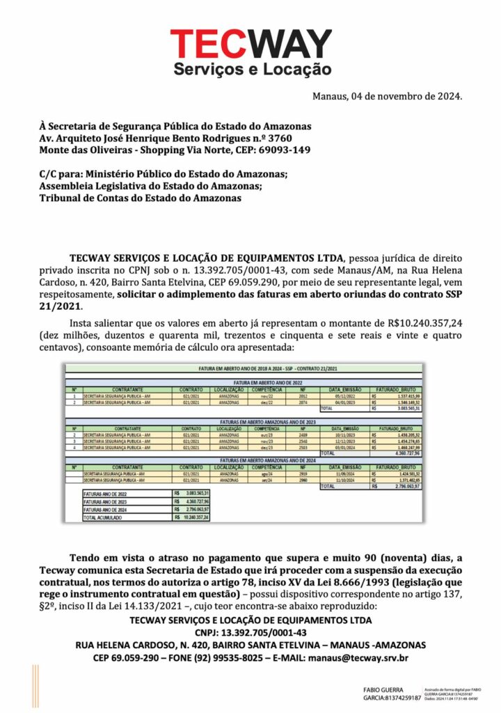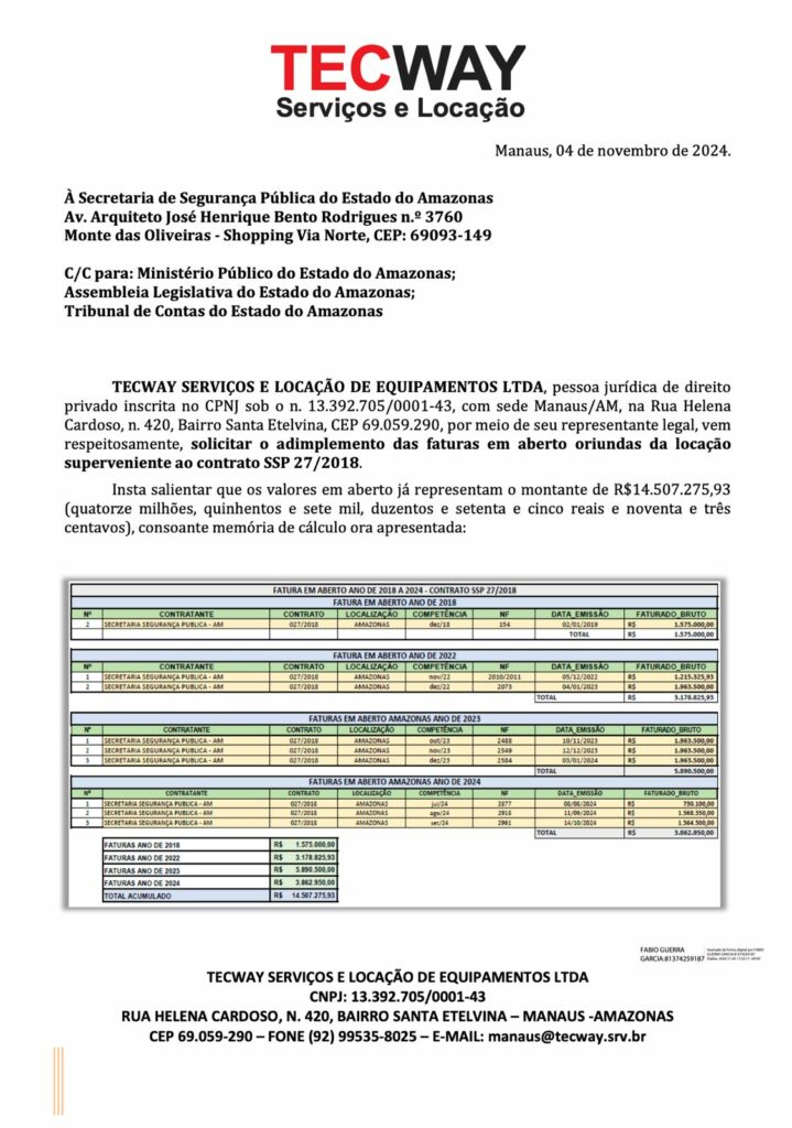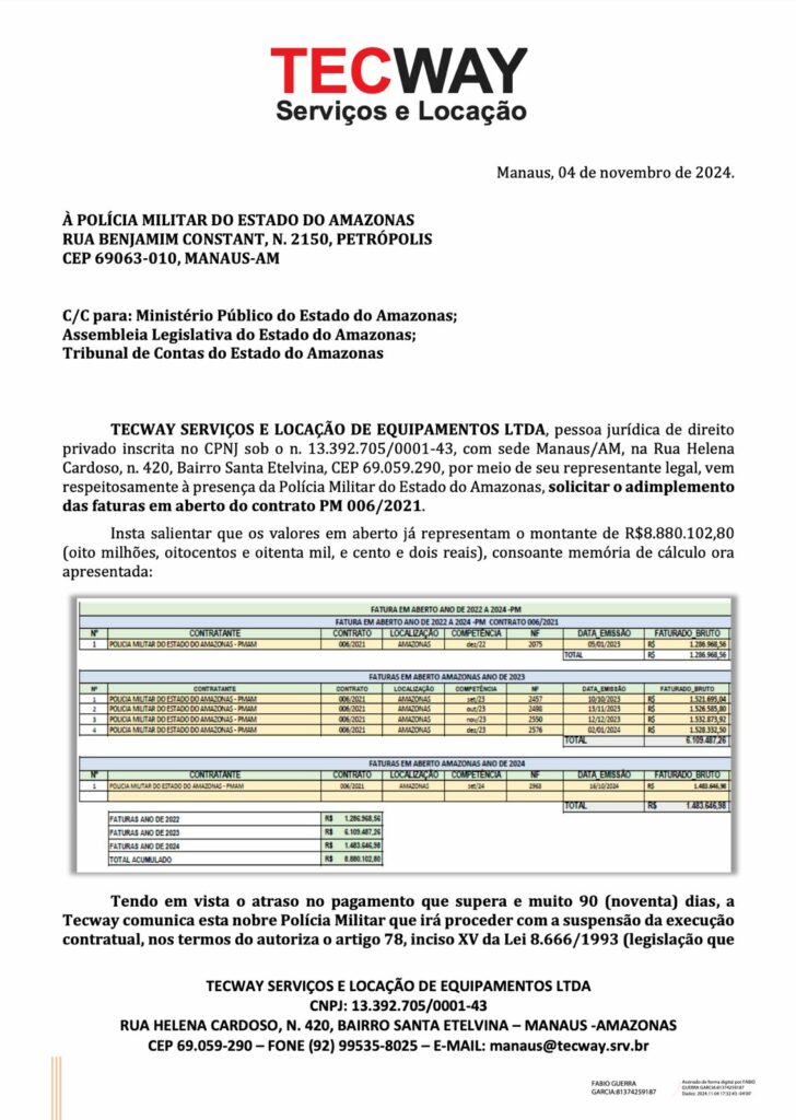 A Tecway informa que a Secretaria de Segurança Pública acumula um débito de R$ 10,24 milhões referente ao contrato SSP 21/2021, e de R$ 14,5 milhões relacionados ao contrato SSP 27/2018. Já o contrato com a Polícia Militar do Estado do Amazonas, identificado como PM 006/2021, acumula uma dívida de R$ 8,88 milhões. Em conformidade com o Artigo 78, inciso XV, da Lei 8.666/1993, que permite a suspensão de obrigações contratuais por atraso superior a 90 dias em pagamentos por parte do governo, a Tecway decidiu interromper a execução dos serviços até que as pendências financeiras sejam regularizadas, para que haja a manutenção necessária nas viaturas.