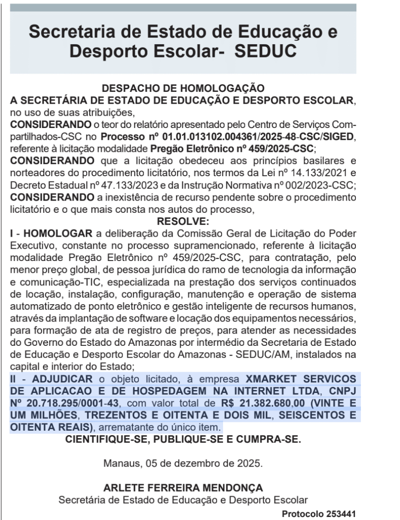 O segundo contrato, de R$ 21.382.680,00, foi conquistado pela XMarket Serviços de Aplicação e Hospedagem LTDA, por meio do Pregão Eletrônico nº 459/2025. A empresa, dona de sistemas de ponto eletrônico e locação de equipamentos, tem entre os sócios Andre Luiz Santos de Souza, Yoram Yaeli e a estrangeira DAY.IO Holdings Limited.
