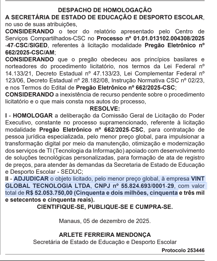 A maior fatia do gasto, R$ 52.053.750,00, foi entregue à empresa Vint Global Tecnologia LTDA, vencedora do Pregão Eletrônico nº 662/2025. A empresa pertence a Nivea Santos de Almeida e à holding SCAF Holding SA, que adiciona uma camada de opacidade ao negócio, dificultando saber de quem é, de fato, a empresa que vai comandar a suposta modernização da Seduc.