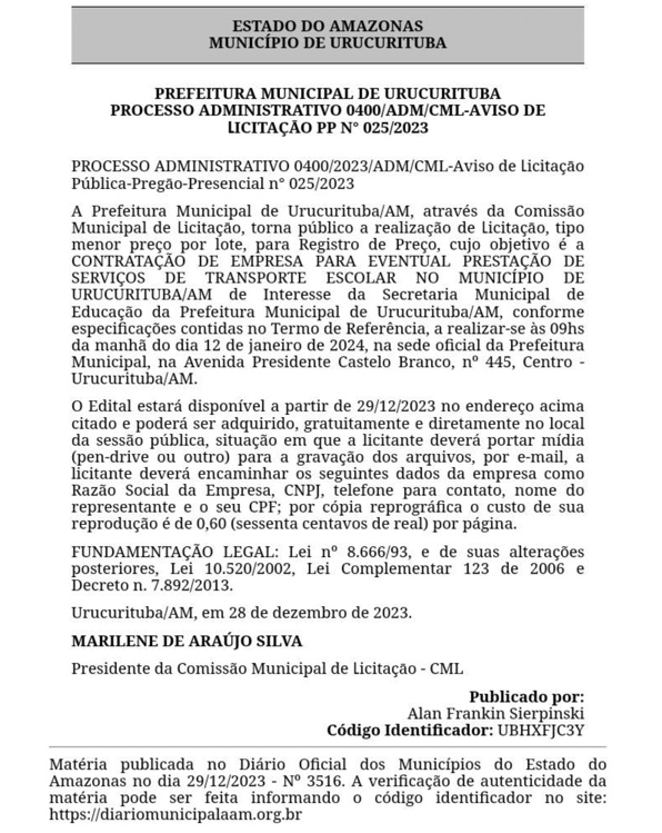 A licitação, tornada pública pela Prefeitura em 29 de dezembro, através do diário da Associação Amazonense de Municípios (AAM), destinava-se à contratação de uma empresa para a prestação de serviços de transporte escolar no município.