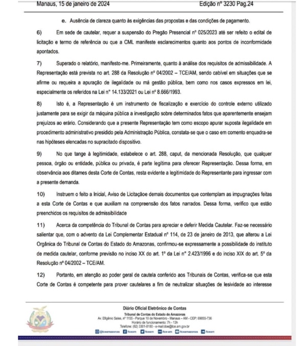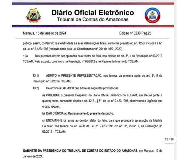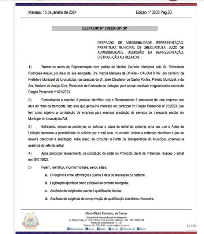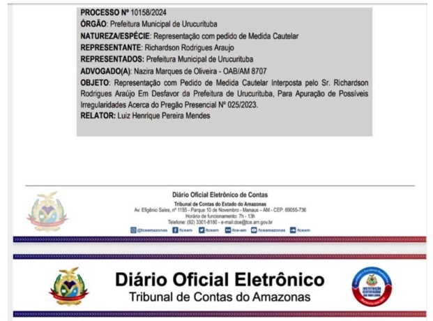 Amazonas – O Tribunal de Contas do Amazonas (TCE-AM) anunciou a admissão de uma Representação com pedido de Medida Cautelar contra a Prefeitura de Urucurituba, da gestão de José Claudenor de Castro Pontes, o “Sabugo” (PT), situada a 207 quilômetros de Manaus. O Processo nº 10158/2024, publicado na edição desta segunda-feira (15/1) do diário oficial da Corte de Contas, destaca possíveis irregularidades no Pregão Presencial nº 025/2023.
