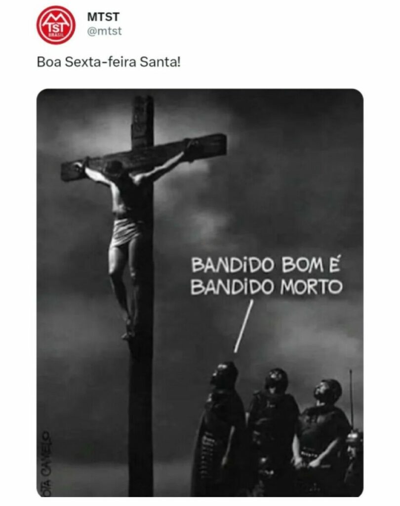 Brasil – Uma publicação gerou uma grande repercussão e indignaçãa, ao ser compartilhada pelo Movimento dos Trabalhadores Sem-Teto (MTST), nesta sexta-feira (29). O post mostrava uma imagem de Jesus sendo crucificado, acompanhada da frase “bandido bom é bandido morto”.