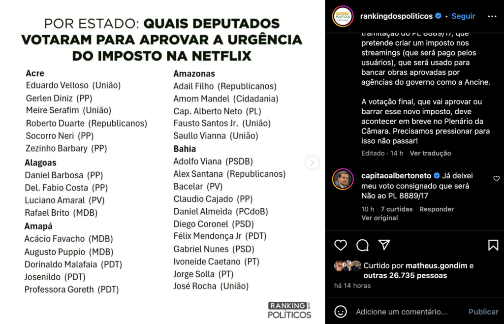 Os deputados do Amazonas que votaram a favor da urgência da PL do imposto na Netflix foram: