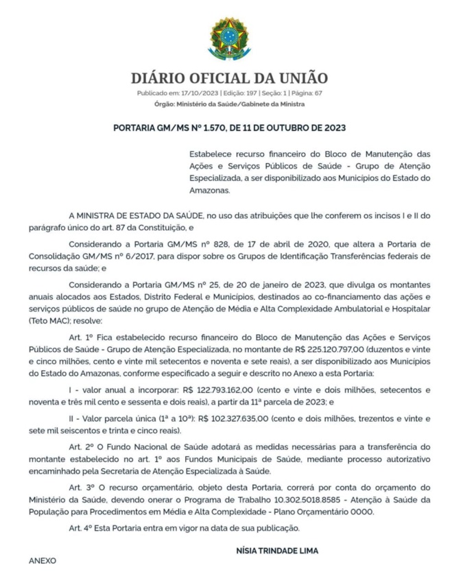 Brasil – A ministra de Estado da Saúde, Nísia Trindade Lima, anunciou um significativo investimento de R$ 225 milhões destinado ao Amazonas. As informações foram divulgadas no Diário Oficial da União (DOU), junto a uma lista que consta quanto cada município irá receber de verba federal.