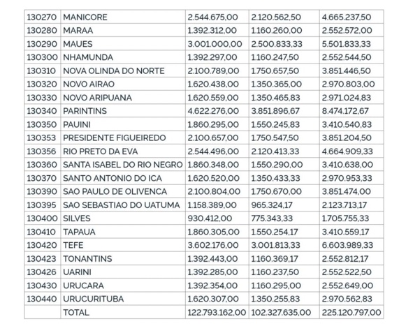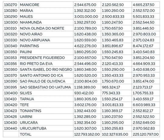 De acordo com as informações divulgadas no Diário Oficial da União (DOU), a ministra estabeleceu que o recurso financeiro totaliza R$ 225.120.797,00 e será destinado aos municípios amazonenses. Esse montante será distribuído ao longo do ano, incorporando R$ 122.793.162,00 a partir da 11ª parcela de 2023, além de uma parcela única que abrange as 10 primeiras parcelas, totalizando R$ 102.327.635,00. Veja: