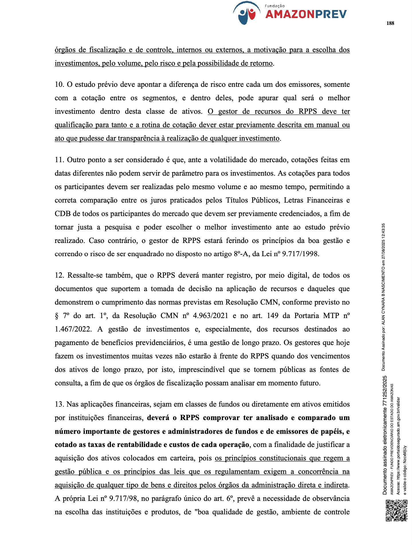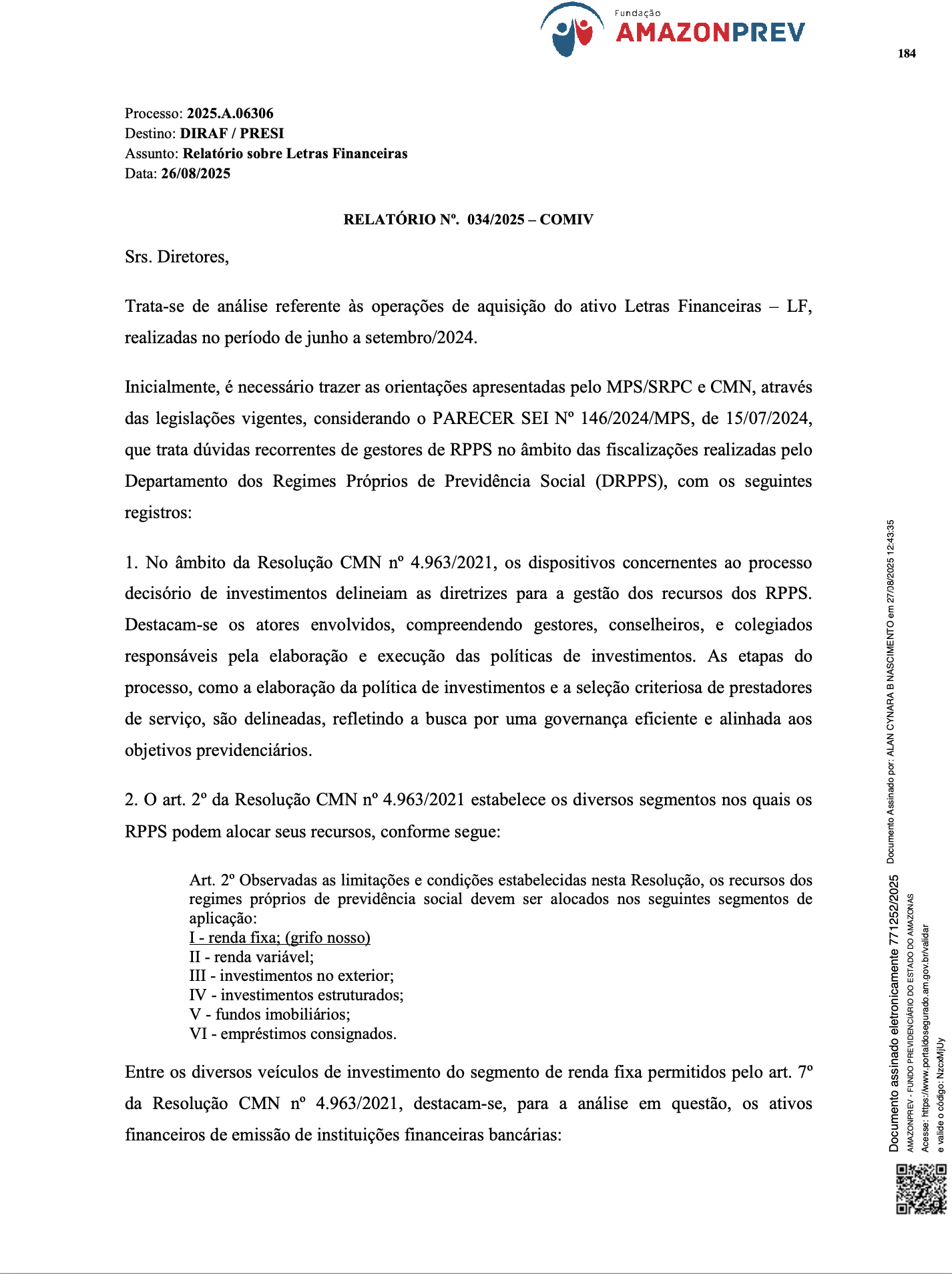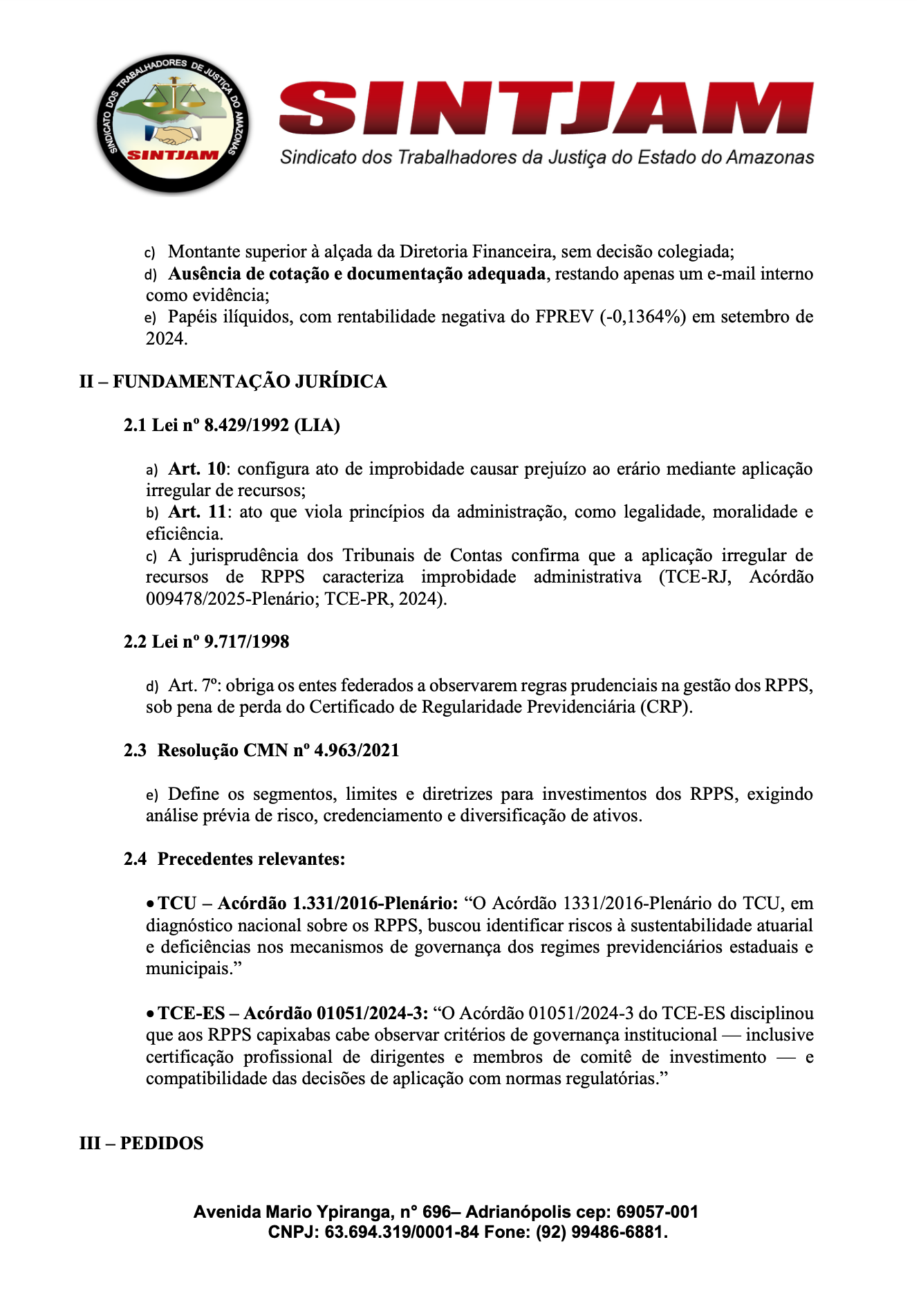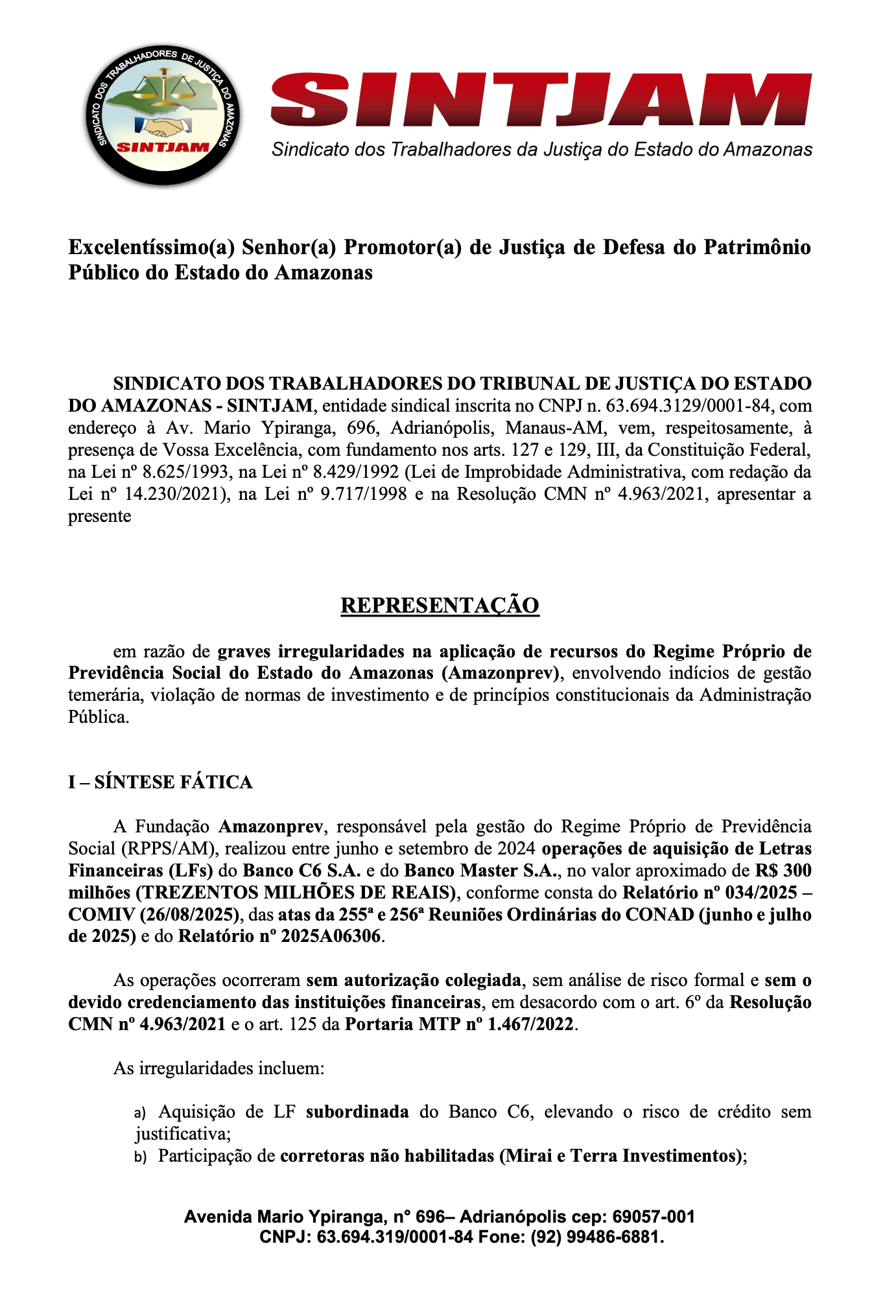 As aplicações, conforme o sindicato, não passaram pela análise nem pela autorização do colegiado da Amazonprev, o que configura uma possível violação às normas internas de governança e à legislação que regula os investimentos previdenciários.