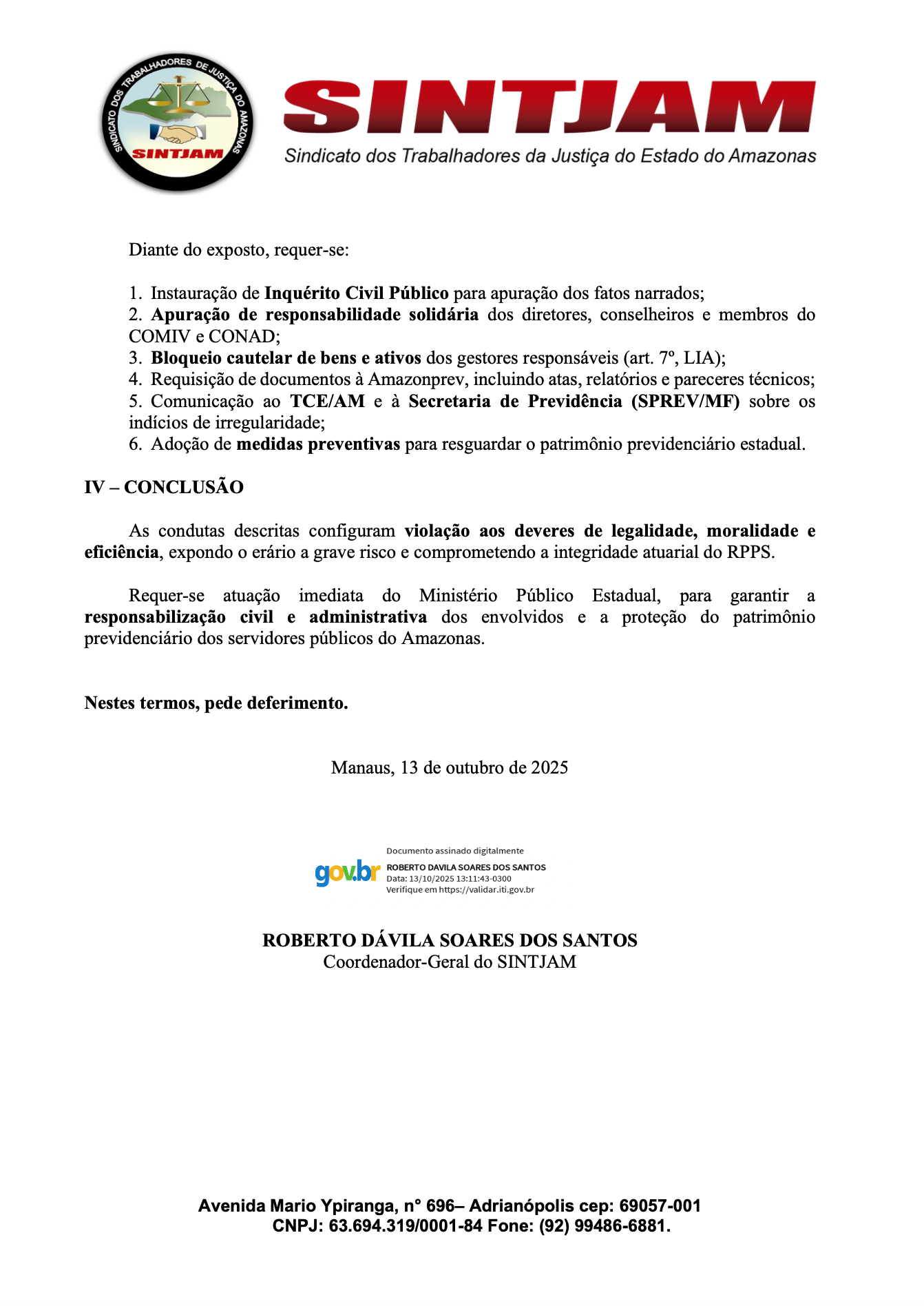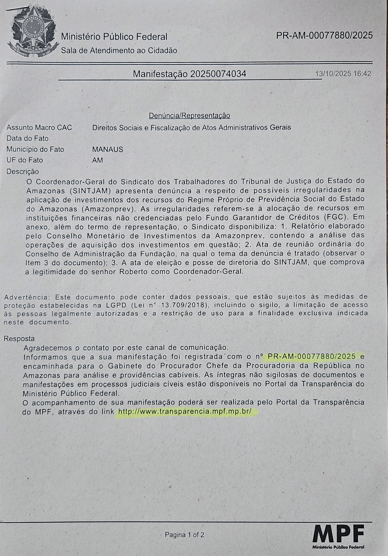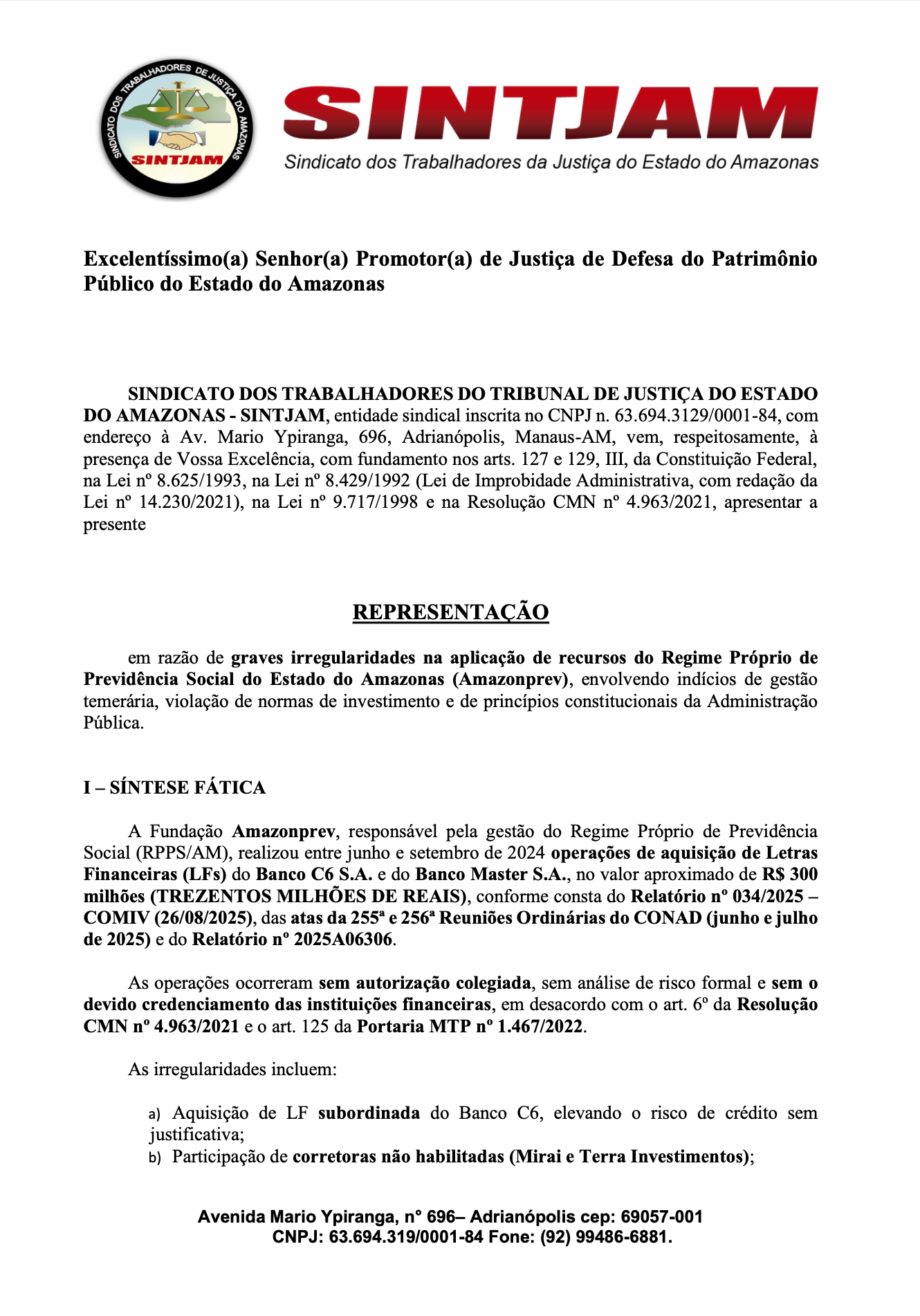 Diante das suspeitas, o sindicato protocolou representações junto ao MP-AM e ao MPF, pedindo a abertura de inquéritos para apurar a violação à ordem financeira e irregularidades na gestão previdenciária, tendo em vista o risco que o erário pode sofrer caso os bancos declarem falência ou algo do gênero. O Sintjam solicita ainda o bloqueio de bens dos responsáveis, a responsabilização dos gestores e o envio das informações ao Tribunal de Contas do Estado.