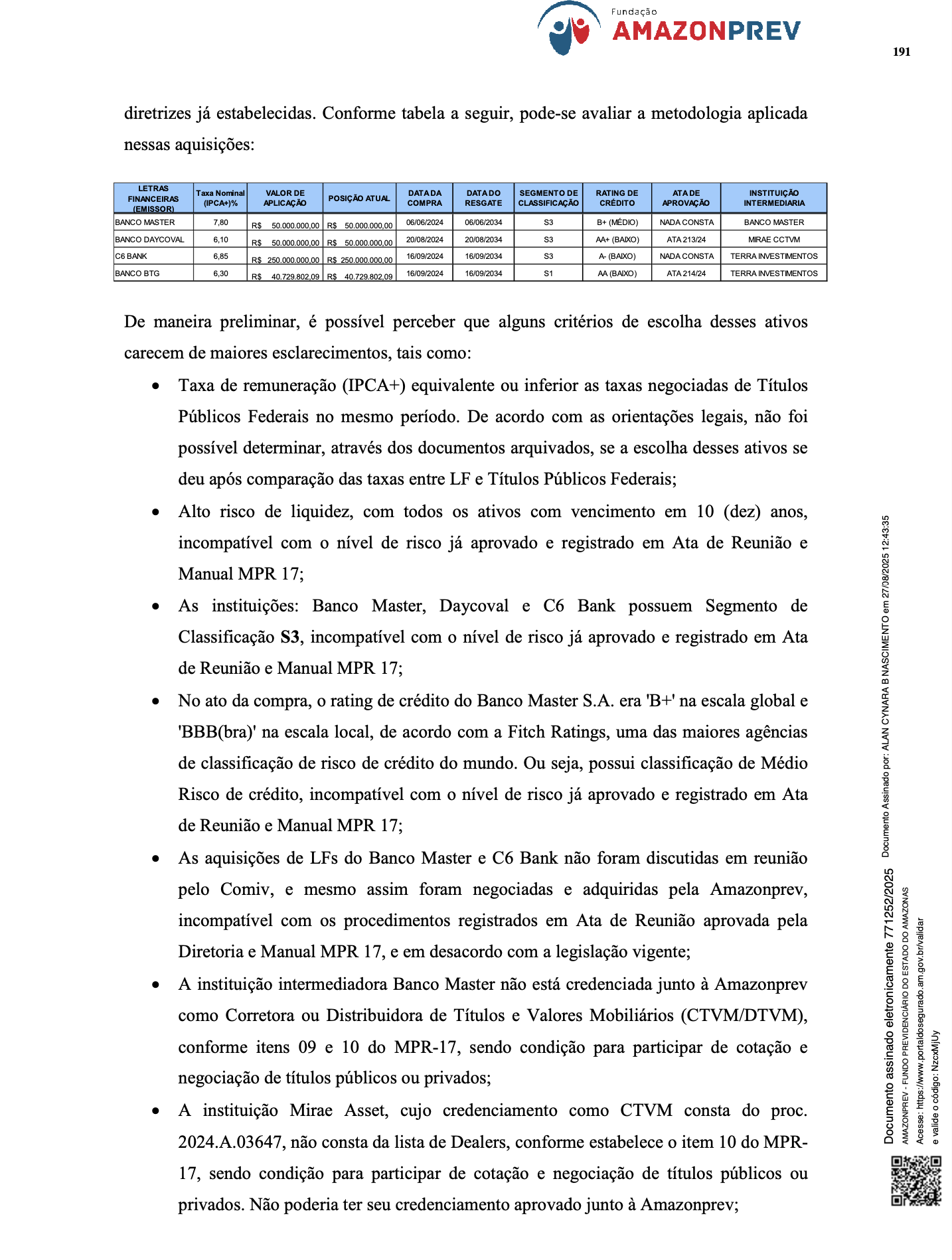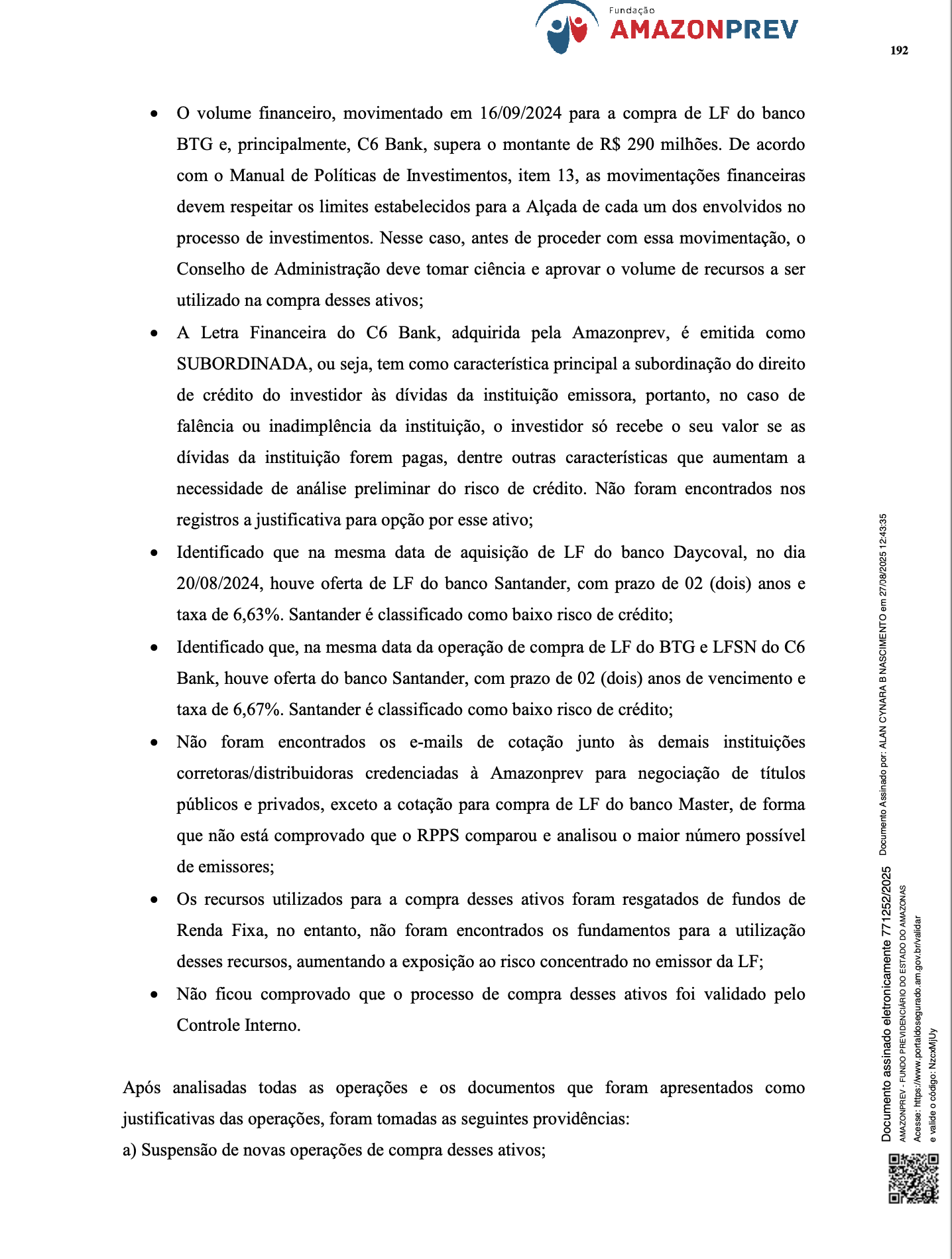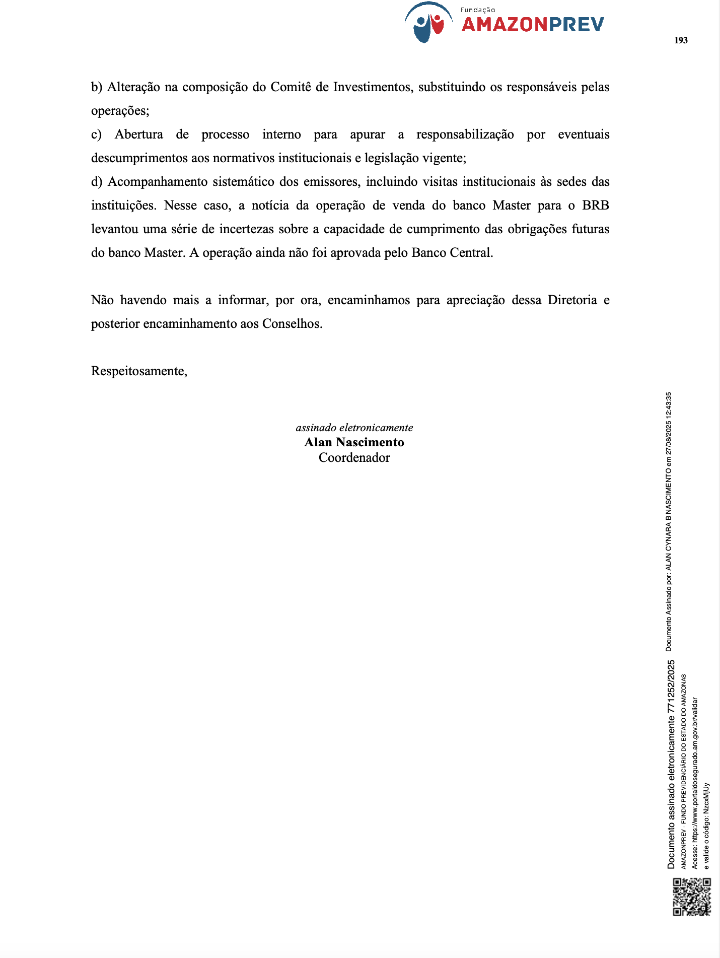 O coordenador-geral do Sintjam, Roberto Dávila, informou que a ausência dos valores foi identificada durante reuniões trimestrais do conselho da fundação. Segundo ele, o então diretor-presidente da Amazonprev, Evilázio Nascimento, apenas afirmou que os recursos haviam sido aplicados entre junho e setembro de 2024 — R$ 50 milhões no C6 S.A. e R$ 250 milhões no Master S.A., sem dar muitos detalhes.
