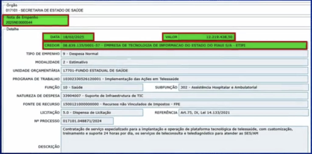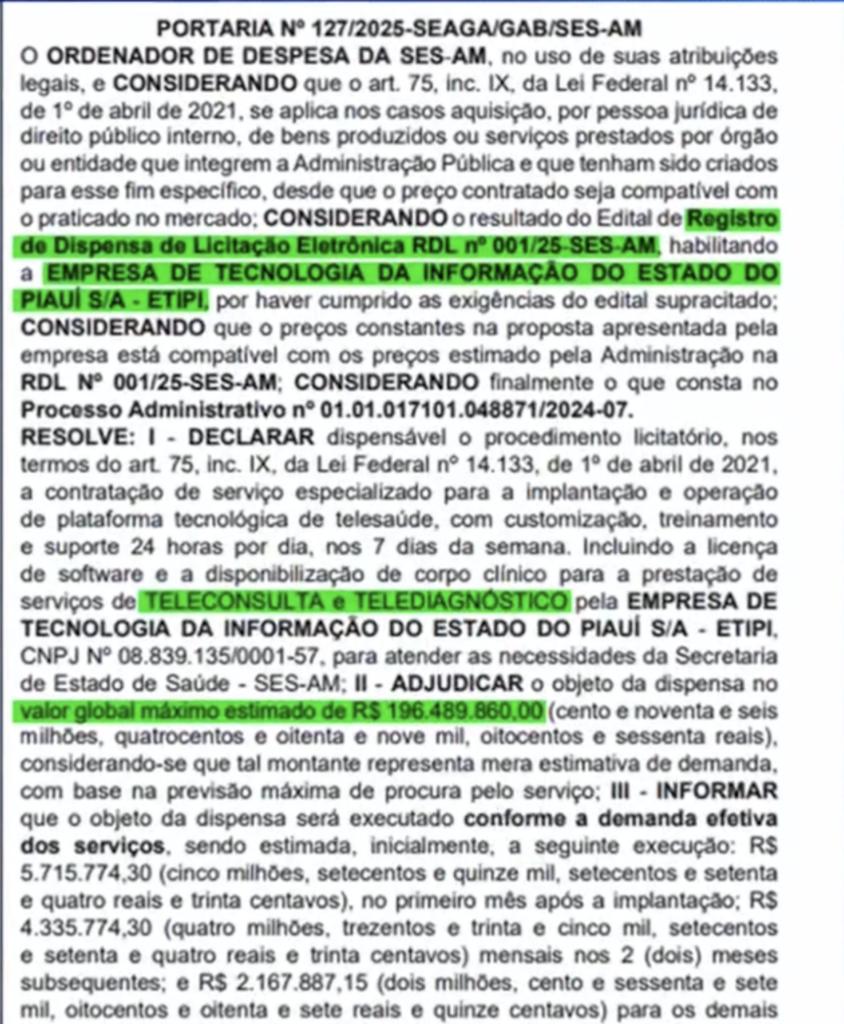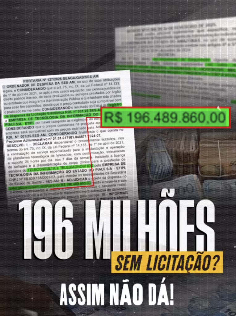 Brasil – O deputado estadual Wilker Barreto (Mobiliza) denunciou nesta quinta-feira (20/2) a contratação milionária, sem licitação, da Empresa de Tecnologia da Informação do Estado do Piauí (ETIPI) pelo Governo do Amazonas. O contrato, estimado em R$ 196,4 milhões, foi firmado por meio de dispensa de licitação (RDL n.º 001/2025-SES-AM) para a implantação e operação de uma plataforma de telessaúde.
