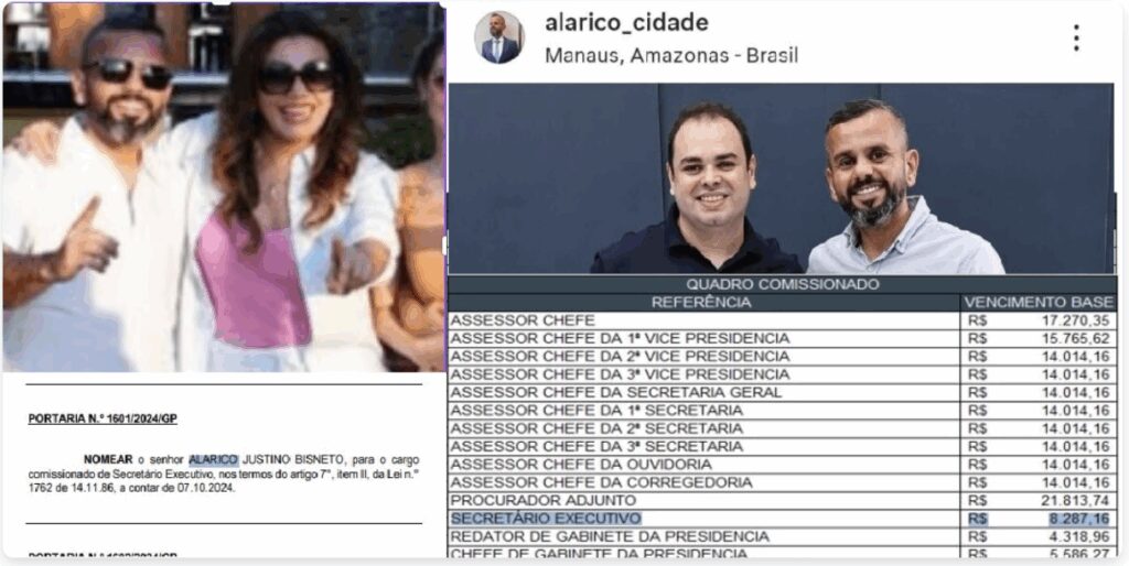 Alarico Justino Bisneto: Primo de Roberto Cidade e companheiro da deputada Alessandra Campelo. Ocupa o cargo de Secretário Executivo da Aleam, com remuneração superior a R$ 8 mil. Críticos frequentemente apontam para a necessidade de maior transparência sobre suas agendas e viagens pelo interior do estado no exercício da função.