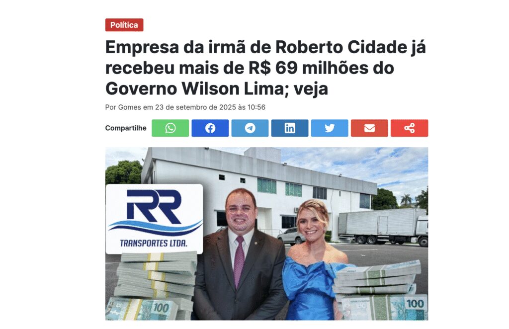 Dados de portais de transparência revelam que empresas ligadas a familiares diretos de Roberto Cidade (incluindo pai, irmãos e sobrinho) firmaram contratos que, somados, ultrapassam R$ 268 milhões com o Governo do Estado durante a atual gestão. Destaca-se, neste montante, valores na casa dos R$ 69 milhões direcionados à RR Serviços de Transporte e Navegação Ltda, pertencente aos irmãos do presidente da Casa.