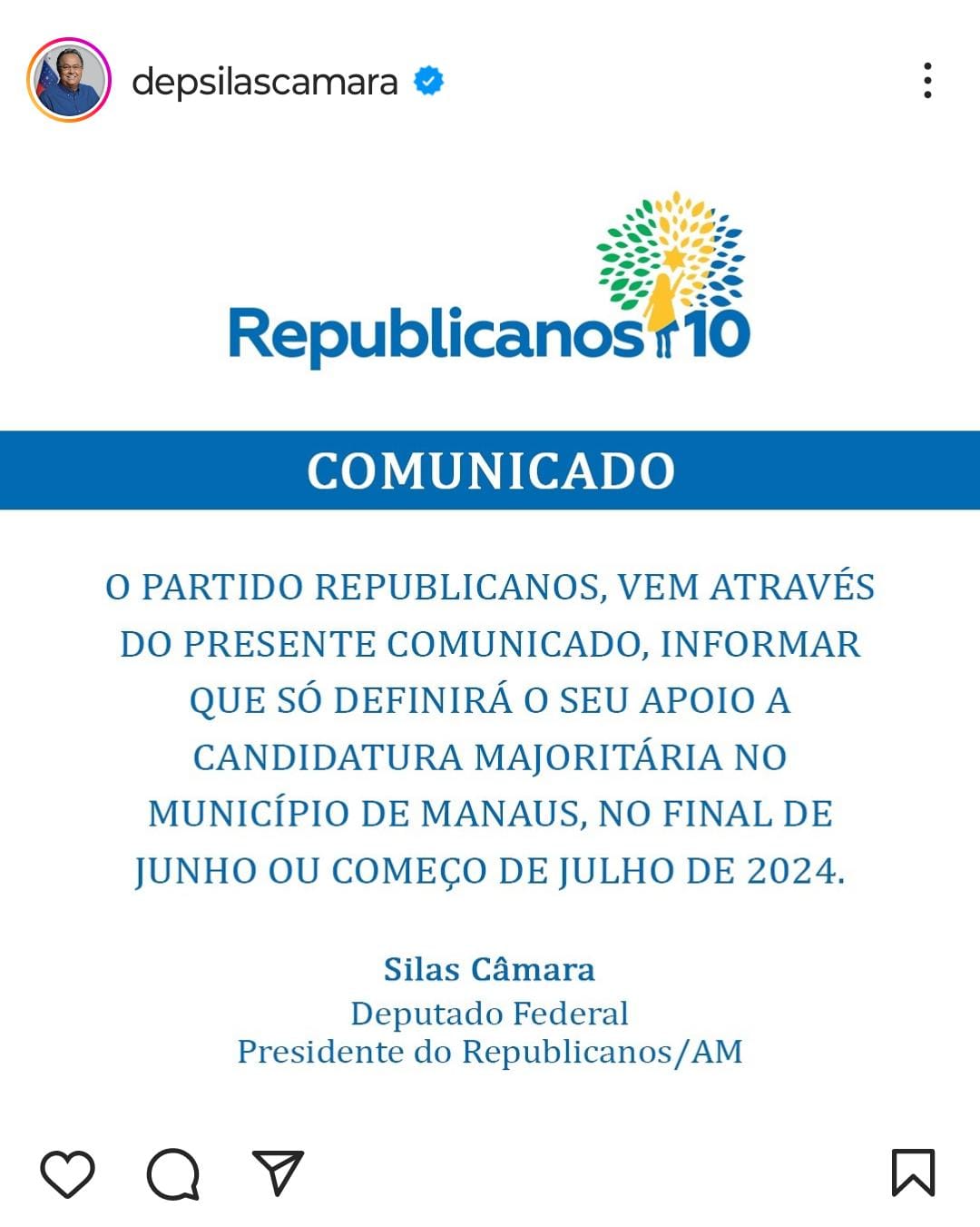 A manifestação pública de Silas ocorreu após eleitores afirmarem que ele estaria concedendo muitos elogios ao Governador Wilson Lima, que é presidente do União Brasil e tem como candidato à prefeitura de Manaus o deputado estadual Roberto Cidade. Sendo assim, muitos acreditavam que estava tudo definido, e que o Republicanos iria apoiar Cidade. No entanto, o apoio do partido de Silas está em negociação.
