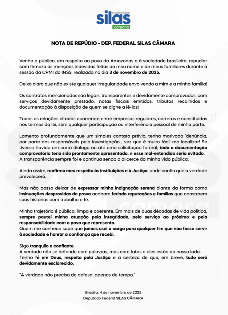 Manaus – O deputado federal Silas Câmara (Republicanos-AM) repudiou as menções ao seu nome e de familiares durante a CPMI do INSS, realizada na segunda-feira (3), sessão marcada pela prisão em flagrante de Abraão Lincoln Ferreira, presidente da Confederação Brasileira dos Trabalhadores da Pesca e Aquicultura (CBPA), por falso testemunho.