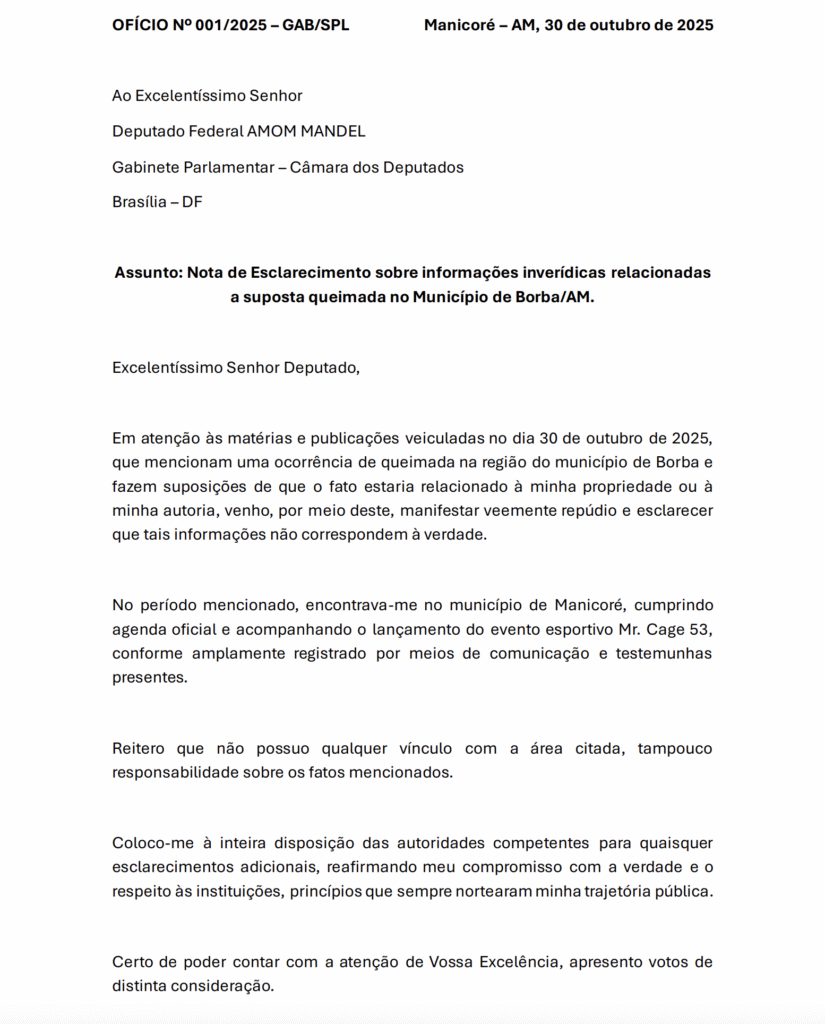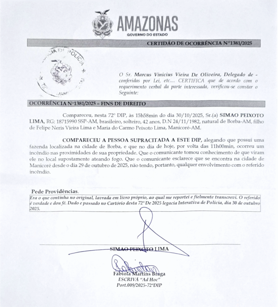 No documento, Peixoto relata que estava na cidade de Manicoré desde o dia 30 de outubro de 2025, cumprindo agenda nas cidades de Novo Aripuanã e Manicoré, o que, segundo ele, comprova sua ausência do local no momento em que o fogo começou.