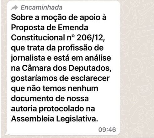 Na nota emitida pelo deputado, ele afirma categoricamente que não apoiou a referida PEC e esclarece: “Sobre a moção de apoio à Proposta de Emenda Constitucional nº 206/12, que trata da profissão de jornalista e está em análise na Câmara dos Deputados, gostaríamos de esclarecer que não temos nenhum documento de nossa autoria protocolado na Assembleia Legislativa”.