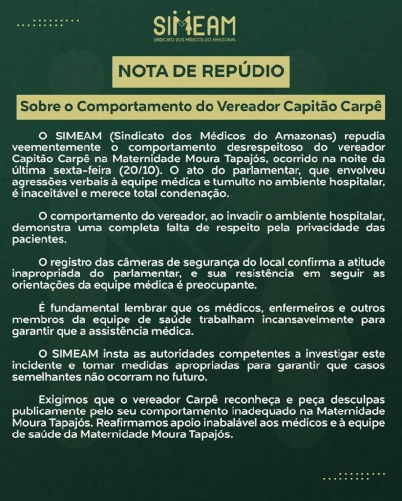 Brasil – O Sindicato dos Médicos do Amazonas (Simeam) emitiu uma contundente nota de repúdio nesta terça-feira (24) em relação ao comportamento do Vereador Capitão Carpê (Republicanos) na Maternidade Moura Tapajós, ocorrido na noite da última sexta-feira (20). O Simeam demonstrou profunda preocupação em relação às alegações de agressões verbais do vereador à equipe médica e ao tumulto que se seguiu no ambiente hospitalar.