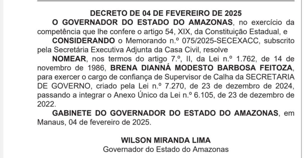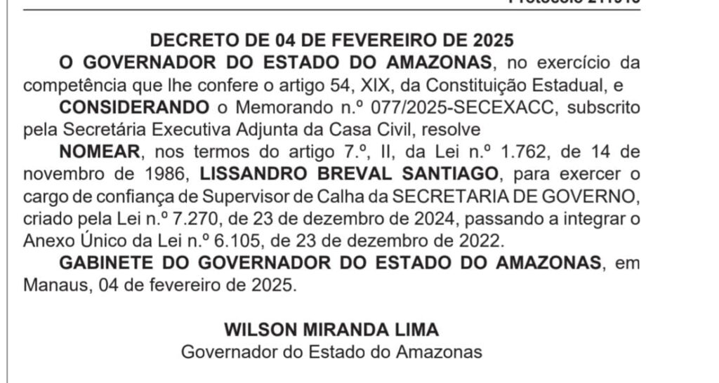 Amazonas – O governador do Amazonas, Wilson Lima, nomeou na última terça-feira (4/2) os ex-vereadores Lissandro Breval (PP) e Brena Dianná (UB) para o cargo de Supervisor de Calha, uma nova função criada pela Lei n.º 7.270, de 23 de dezembro de 2024. A nomeação foi publicada no Diário Oficial do Estado na sexta-feira (6/2) e está vinculada à Secretaria de Governo do Estado do Amazonas (Segov).