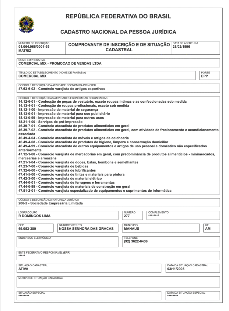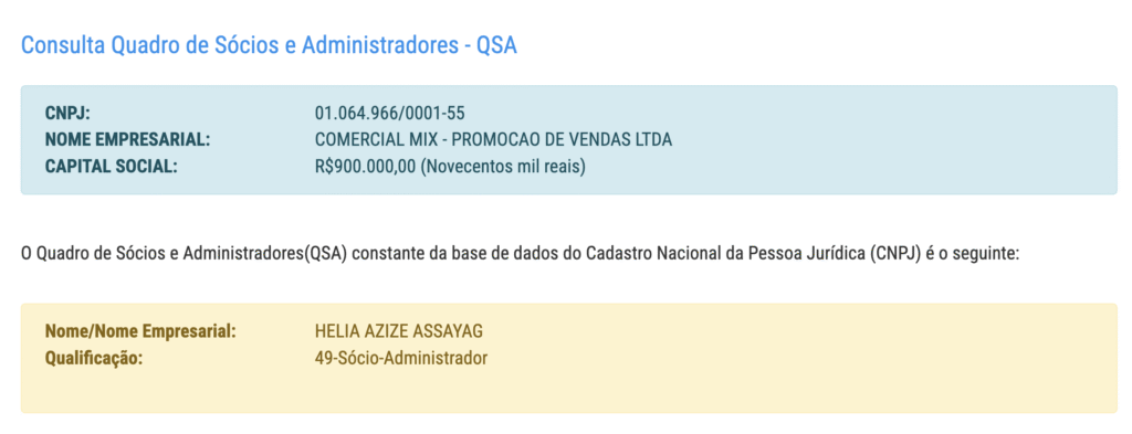 De acordo com dados da Receita Federal, a Comercial Mix está registrada sob o CNPJ 01.064.966/0001-55, com capital social de R$ 900 mil e tem como proprietária Helia Azize Assayag.
