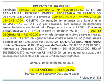 O contrato mais recente, assinado em 10 de setembro de 2025 pelo secretário Diego Américo, prevê a aquisição de material esportivo no valor de R$ 1,7 milhão.