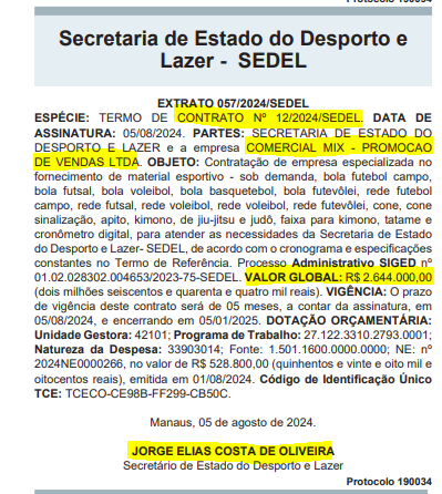 Amazonas – A Secretaria de Estado do Desporto e Lazer (Sedel), destinou, em pouco mais de um ano, cerca de R$ 4,3 milhões em contratos para a empresa Comercial Mix – Promoção de Vendas Ltda., considerada nos bastidores políticos como “a queridinha” do governador Wilson Lima.