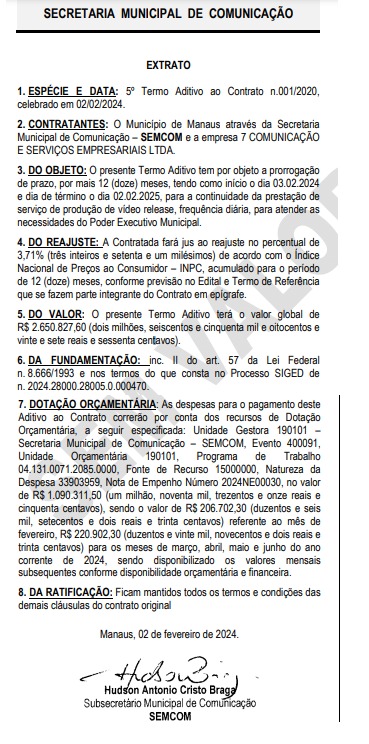 O contrato, celebrado em 2 de fevereiro de 2024 e assinado pelo subsecretário Hudson Braga, foi prorrogado com a empresa 7 Comunicação, por mais 12 meses.