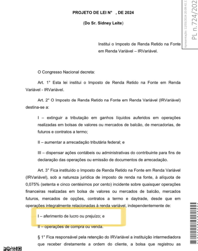 O projeto visa instituir o Imposto de Renda Retido na Fonte em Renda Variável (IRVariável), o que pode afetar negativamente aqueles que operam no mercado financeiro.