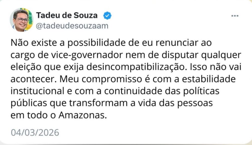 Amazonas – O vice-governador do Estado, Tadeu de Souza (PP-AM), usou as redes sociais na noite desta quarta-feira (04) para encerrar especulações sobre uma possível renúncia ao cargo. Em declaração direta, ele afirmou que permanecerá na função e descartou qualquer intenção de disputar cargo eletivo que exija desincompatibilização neste ano.