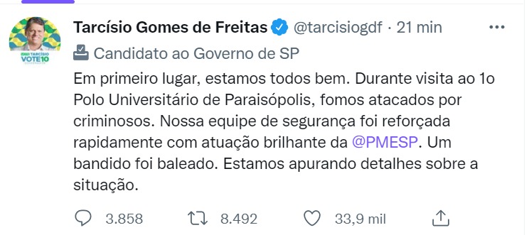 Brasil – O ex-ministro da Infraestrutura e candidato ao Governo de SP, Tarcisio de Freitas acaba de sofrer um atentado na manhã desta segunda-feira (17) em Paraisópolis, SP. Uma equipe da Jovem Pan estava próxima.