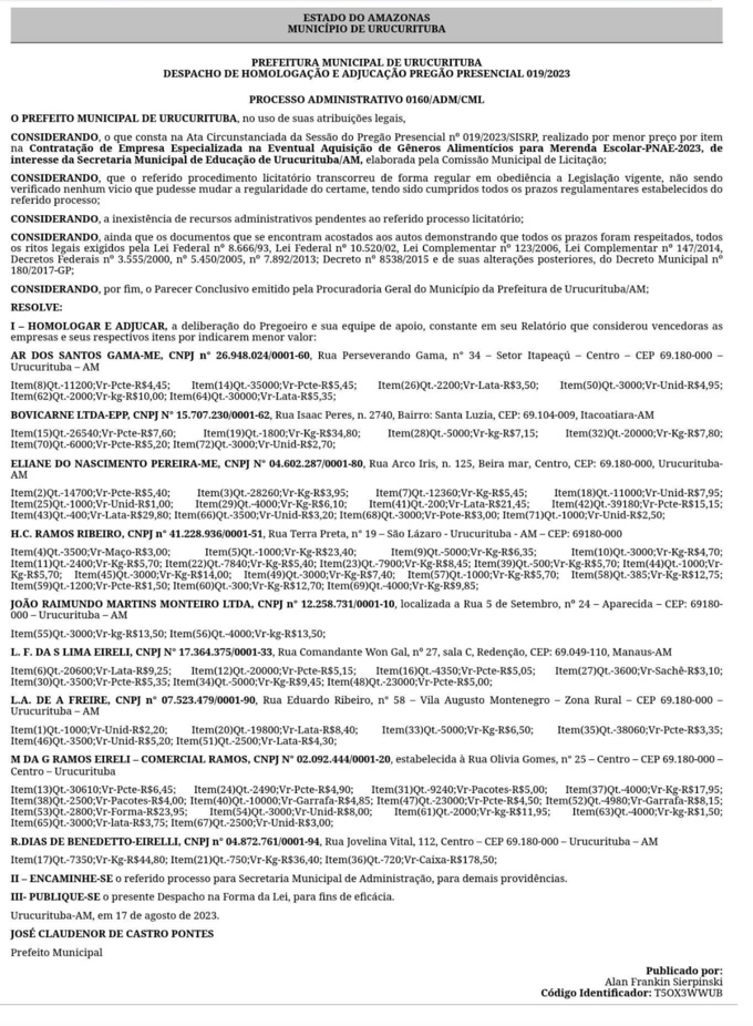 Amazonas – O Tribunal de Contas do Estado do Amazonas (TCE-AM) acatou Representação contra o prefeito de Urucurituba, José Claudenor Pontes, o Sabugo. O órgão irá apurar possíveis irregularidades em um Pregão Presencial de merenda escolar.