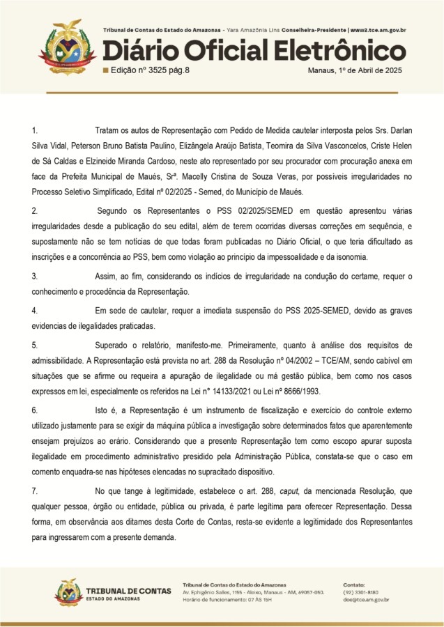 O TCE-AM não mediu palavras ao detalhar os problemas encontrados. Segundo o documento, o PSS apresentou barreiras que dificultaram a inscrição de candidatos, minando a ampla concorrência e ferindo os pilares da impessoalidade e da isonomia. “Considerando os indícios de irregularidade na condução do certame, requer o conhecimento e procedência da Representação. Em sede de cautelar, requer a imediata suspensão do PSS 2025-SEMED, devido às graves evidências de ilegalidades praticadas”, destaca um trecho da decisão. As falhas, ainda não detalhadas publicamente em sua totalidade, sugerem um processo mal planejado ou, pior, mal intencionado.