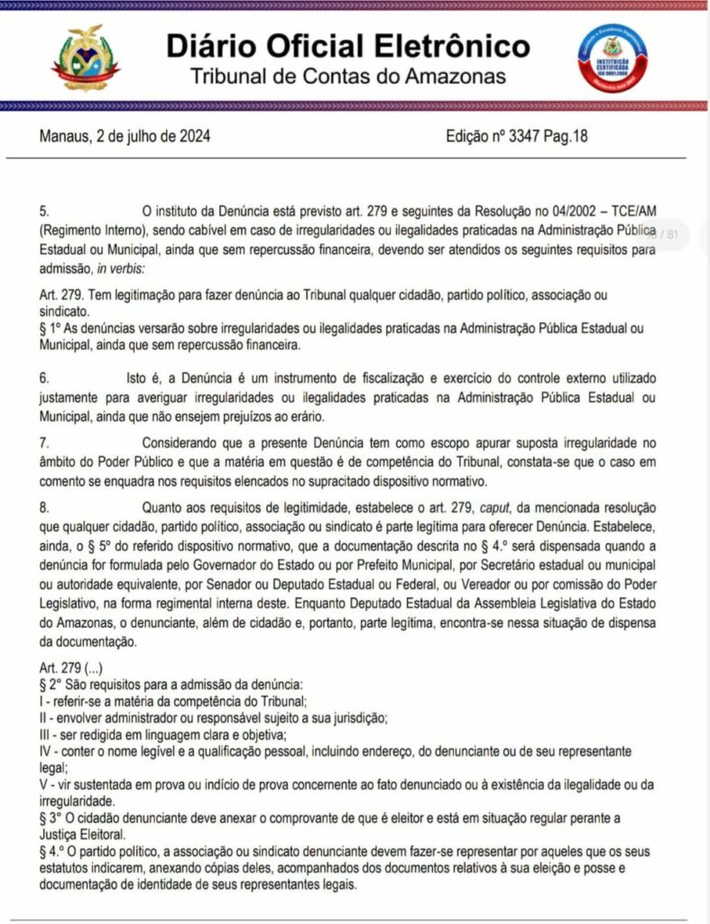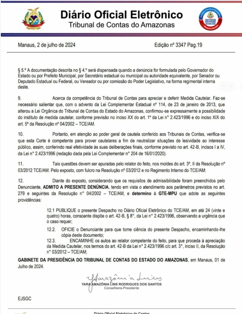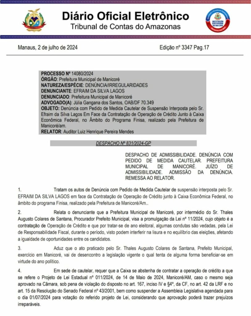 Amazonas – O Tribunal de Contas do Estado do Amazonas (TCE-AM) acatou, nesta terça-feira, uma denúncia com pedido de Medida Cautelar de suspensão interposto por Efraim da Silva Lagos. A denúncia refere-se à contratação de operação de crédito junto à Caixa Econômica Federal (CEF) no âmbito do programa Finisa, realizada pela Prefeitura de Manicoré, sobre comando deLúcio Flávio (PSD), situada a 456 quilômetros de Manaus.