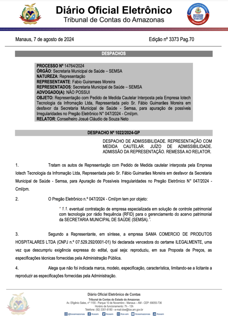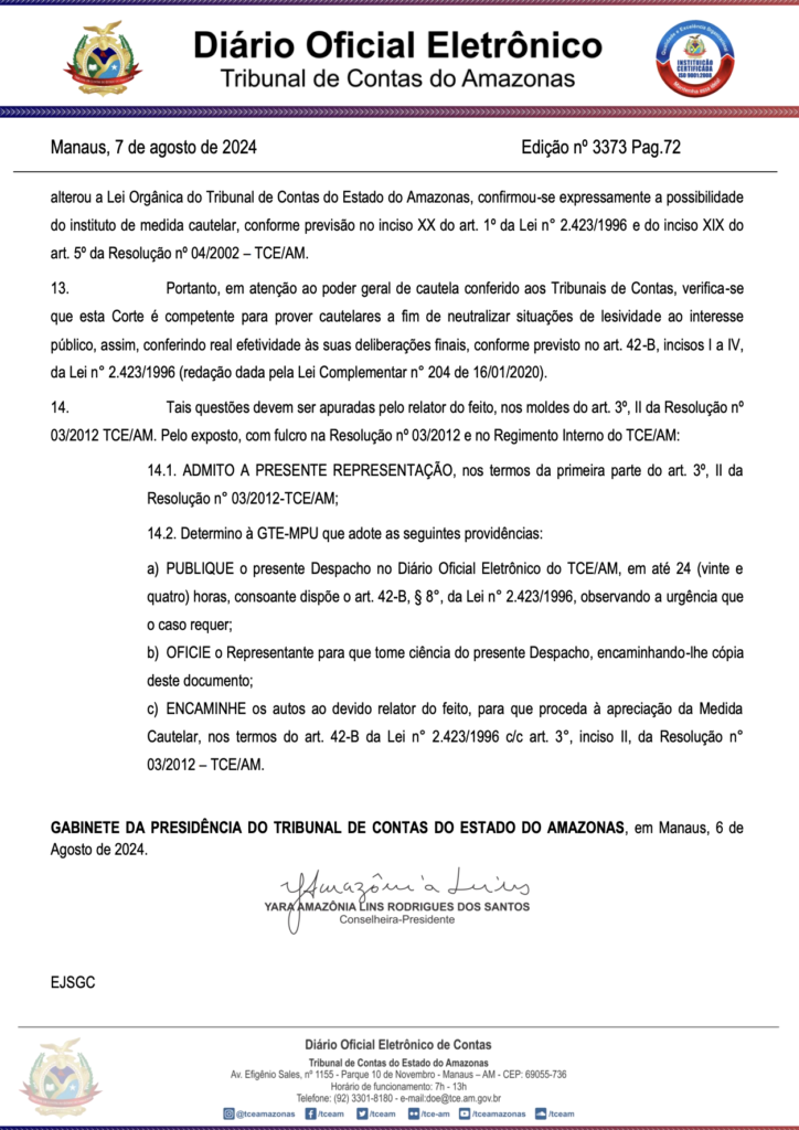 A decisão partiu após o TCE-AM acatar Representação com Pedido de Medida Cautelar interposta pela empresa Iotech Tecnologia da Informação LTDA.