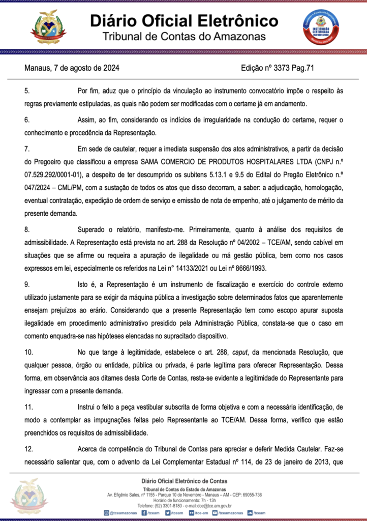 De acordo com o órgão judiciário, a ganhadora do certame, Sama Comércio de Produtos Hospitalares LTDA, foi declarada vencedora ilegalmente. Nesse caso, o TCE-AM solicita a suspensão imediata.