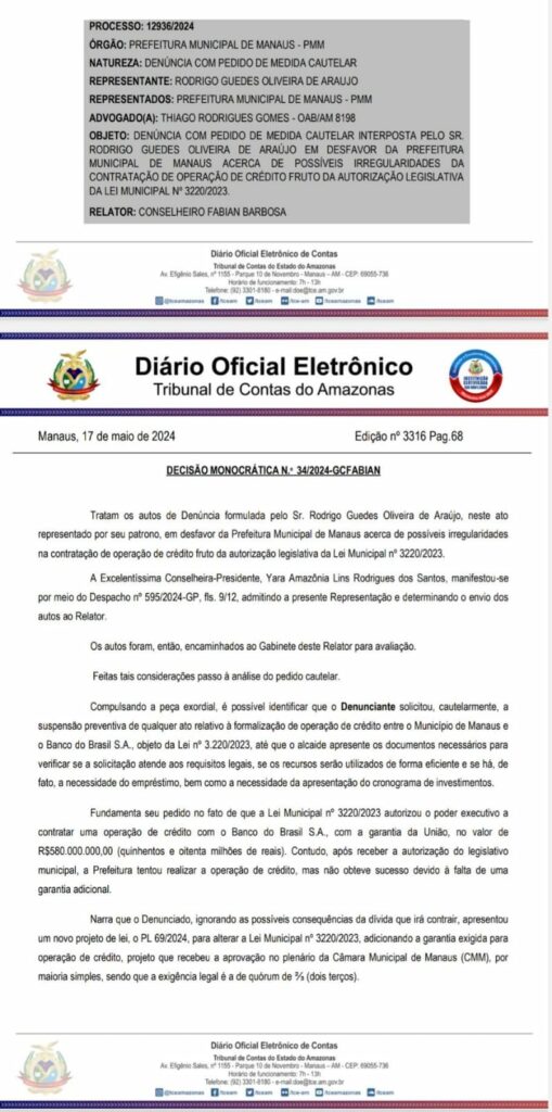 Amazonas – O Tribunal de Contas do Estado do Amazonas (TCE-AM) estabeleceu um prazo de cinco dias para que a Prefeitura de Manaus forneça explicações detalhadas sobre um empréstimo de R$ 580 milhões. A empréstimo foi aprovado após o chefe do executivo municipal apresentar o Projeto de Lei nº 69/2024, que modifica a Lei Municipal nº 3220/2023, incluindo garantias exigidas para a realização do empréstimo.