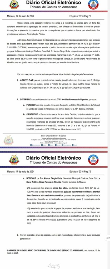 O documento do TCE-AM, assinado pelo relator conselheiro Fabian Barbosa, ressalta que “foram identificadas dúvidas que vindicam maiores esclarecimentos para prolação da decisão”. Portanto, o tribunal decidiu aguardar as informações e justificativas do Secretário Municipal Chefe da Casa Civil, Marcos Sérgio Rotta, e do próprio prefeito David Almeida.