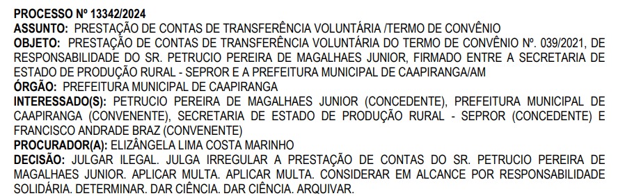 O processo, registrado sob o nº 13342/2024, apontou falhas na execução do convênio e levou à aplicação de multas aos gestores envolvidos.