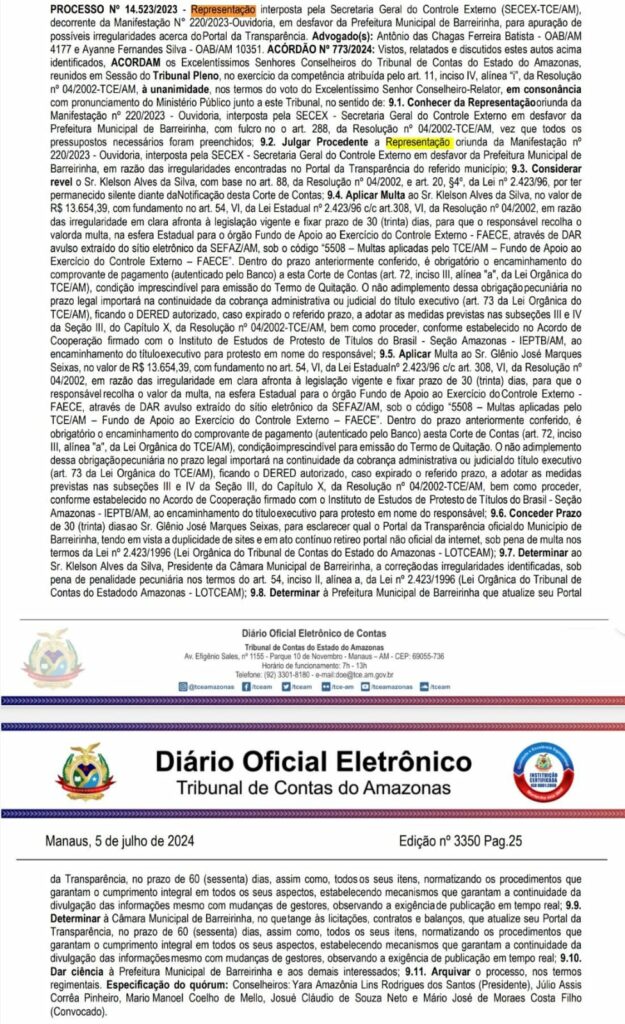 Além de Glênio Seixas, o presidente da Câmara Municipal de Barreirinha, Klelson Alves da Silva (União Brasil), também foi penalizado pelo TCE-AM com uma multa do mesmo valor e prazo para pagamento. As sanções refletem a seriedade das falhas identificadas pelo órgão fiscalizador, que exigiu medidas imediatas para corrigir as deficiências.