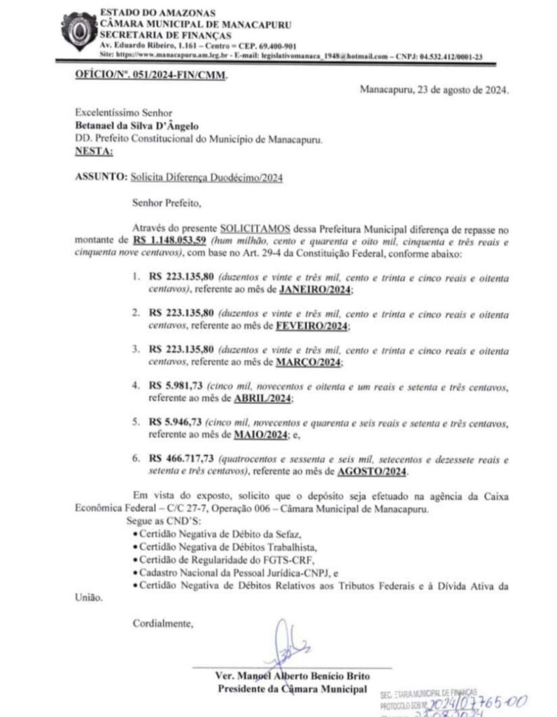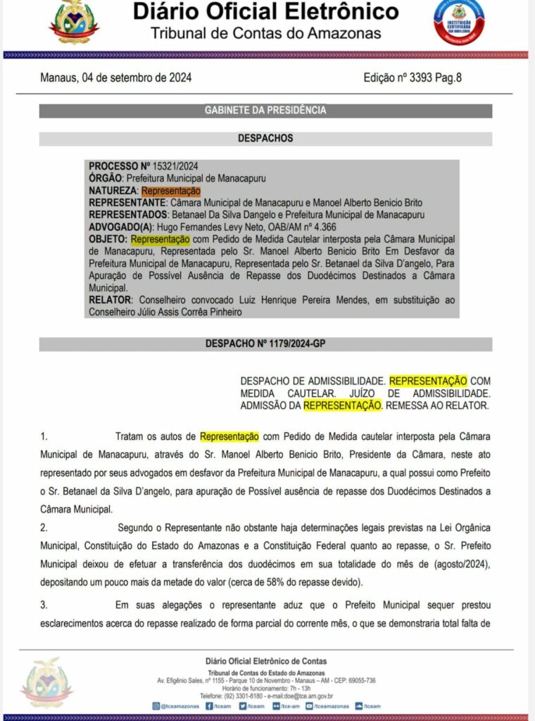 Brasil – Em um movimento decisivo, o Tribunal de Contas do Estado do Amazonas (TCE-AM) requisitou o bloqueio de R$ 466 mil das contas da Prefeitura de Manacapuru após uma denúncia grave contra o prefeito Betanael da Silva D’Angelo (Republicanos). A ação surge em resposta a uma alegação da Câmara Municipal de Manacapuru, liderada pelo presidente Manoel Alberto Benício Brito, conhecido como “Tchuco Benício”.