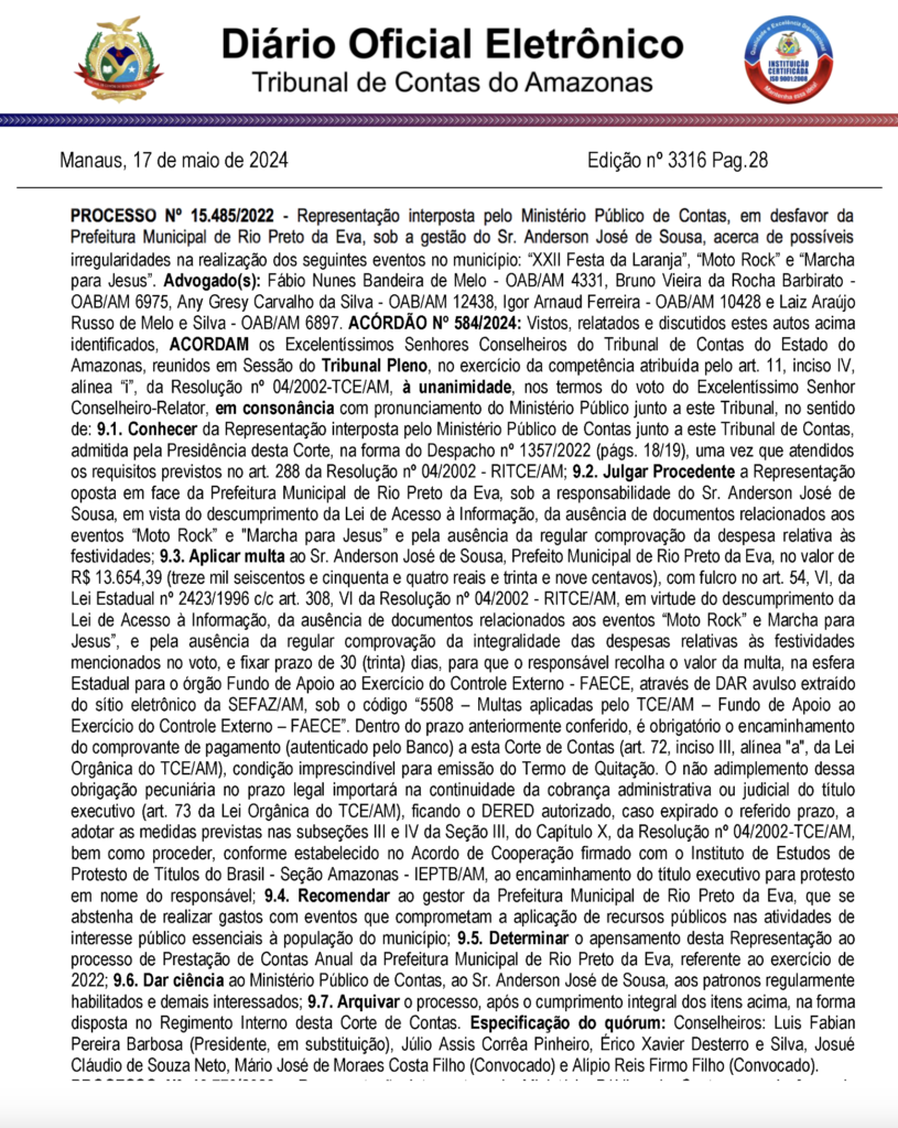 Amazonas – O prefeito de Rio Preto da Eva, Anderson Sousa (UB), recebeu uma multa de R$ 13 mil do Tribunal de Contas do Estado do Amazonas (TCE-AM) devido a irregularidades na organização dos eventos “XXII Festa da Laranja”, “Moto Rock” e “Marcha para Jesus”.