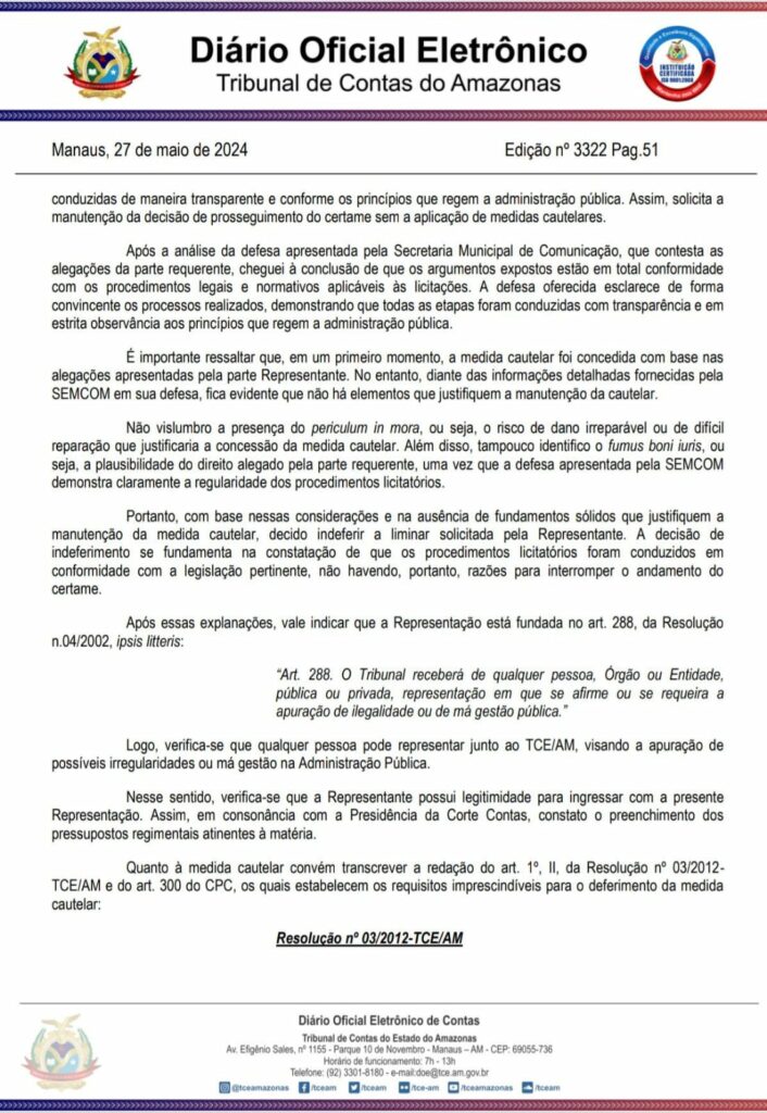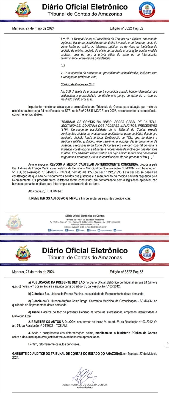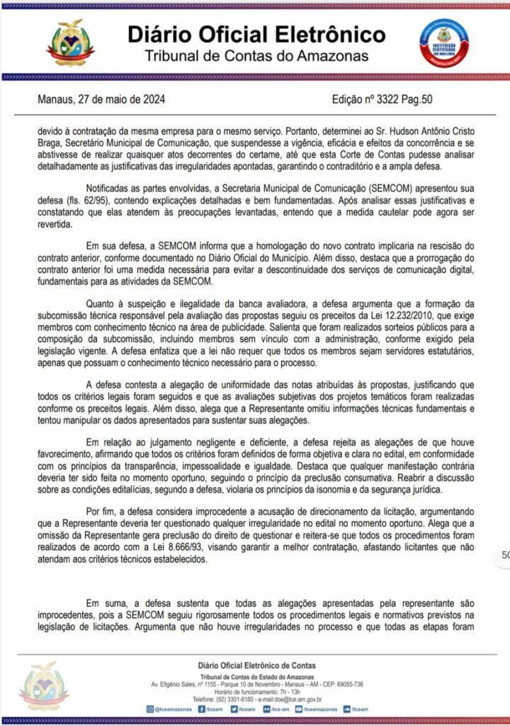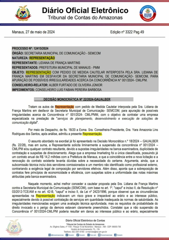 Manaus – O Tribunal de Contas do Estado do Amazonas (TCE-AM) reverteu sua própria decisão ao desfazer um ato anterior relacionado à Secretaria Municipal de Comunicação (Semcom). O órgão aceitou uma Representação com Pedido de Medida Cautelar para investigar possíveis irregularidades na Concorrência 001/2024 – CML/PM, mas posteriormente desfez a medida de forma inesperada.