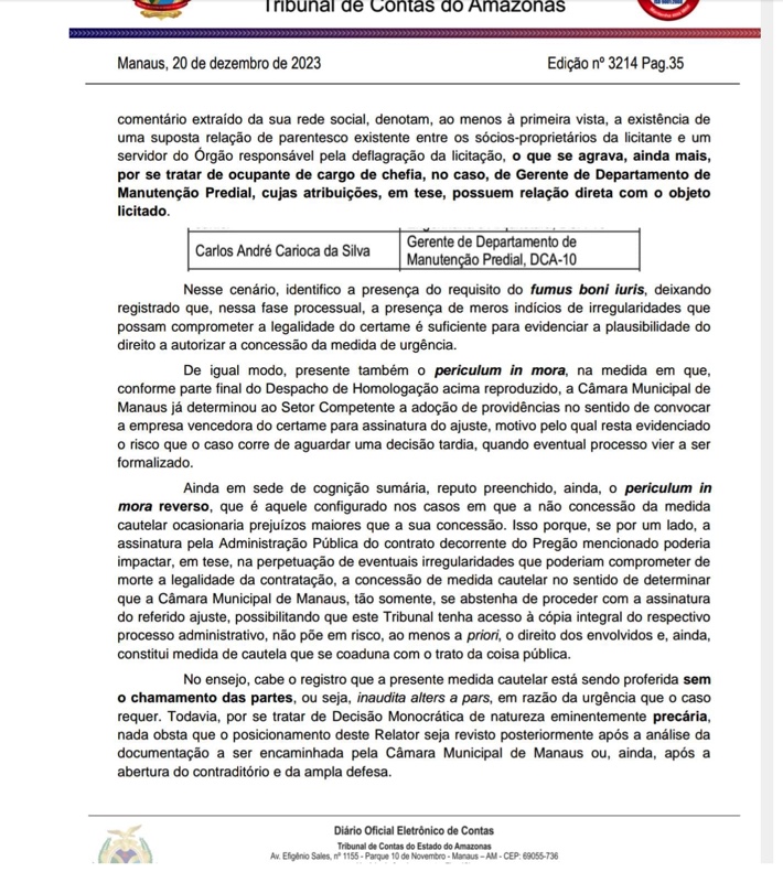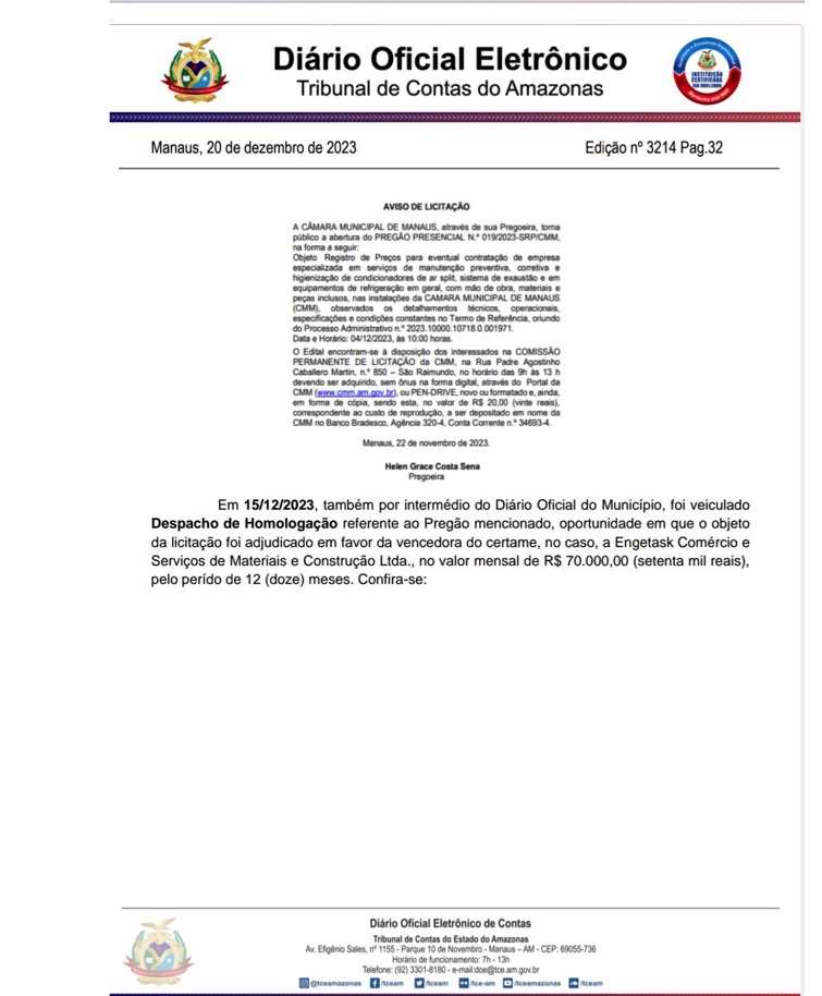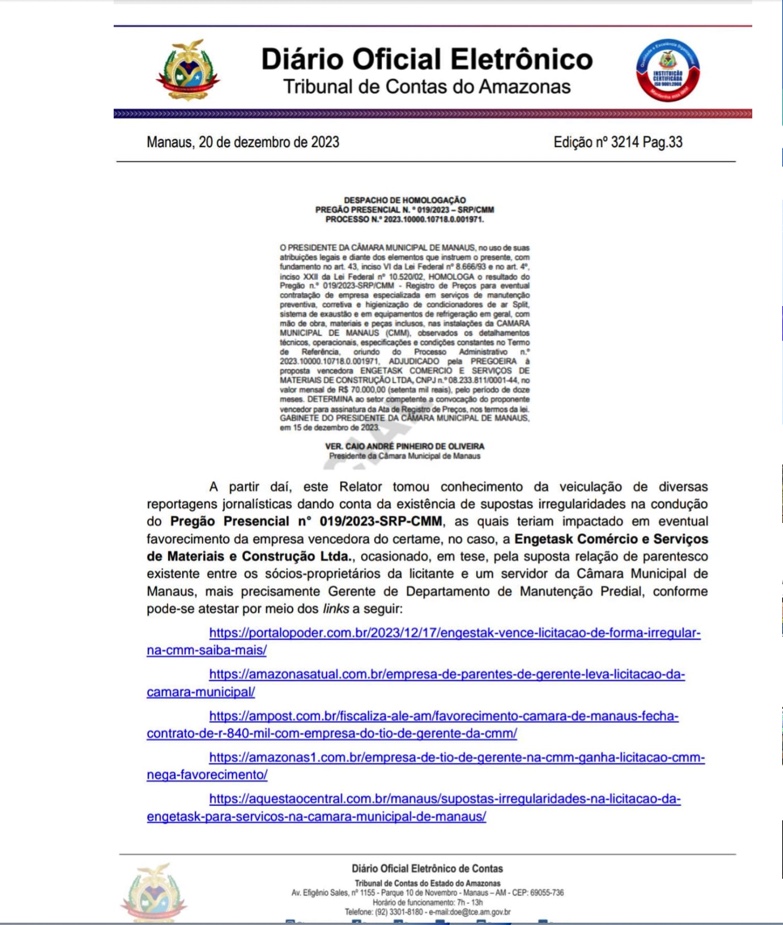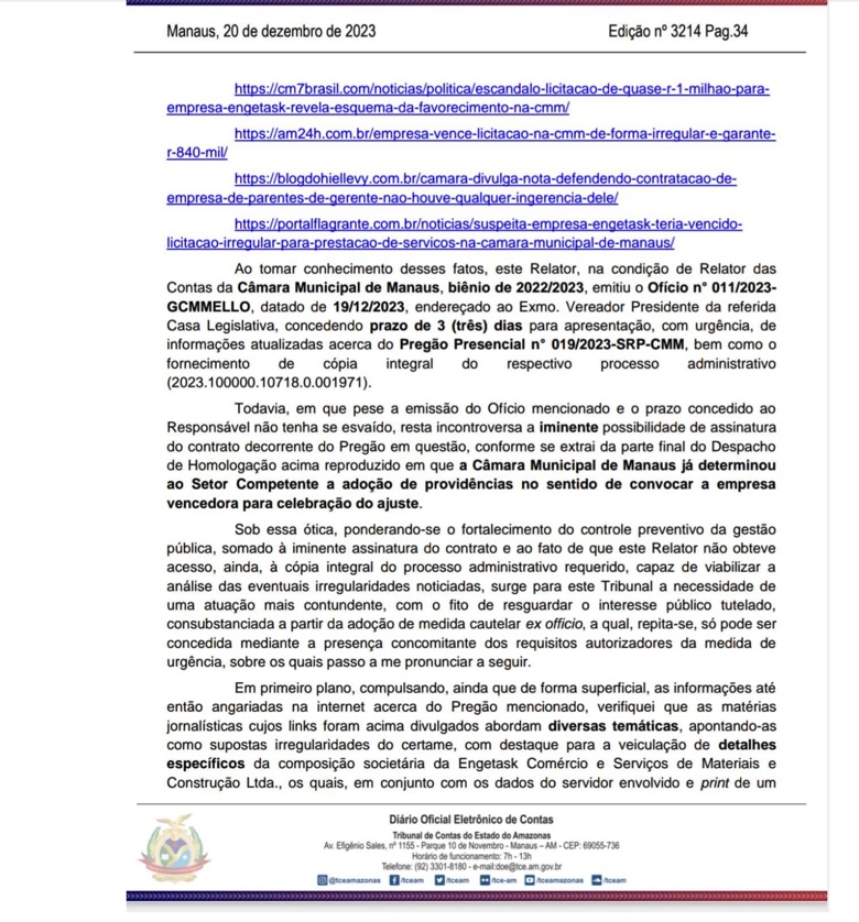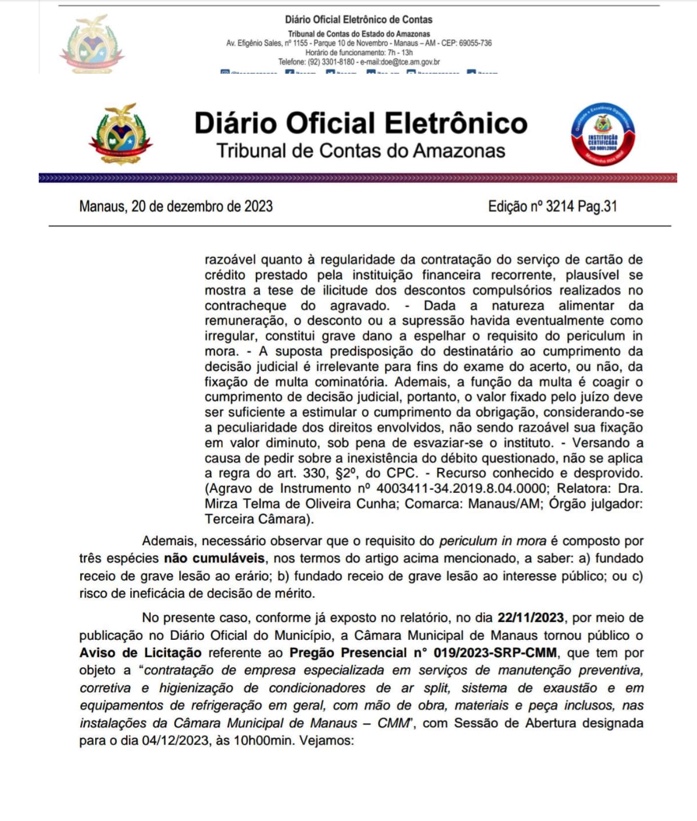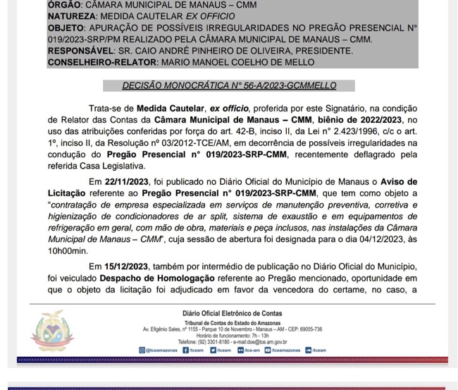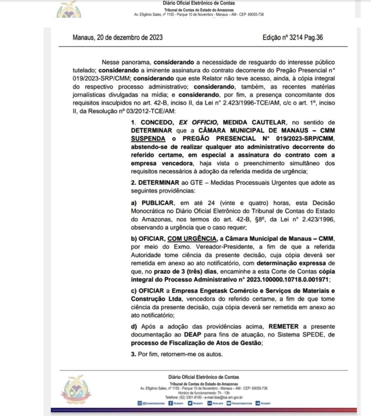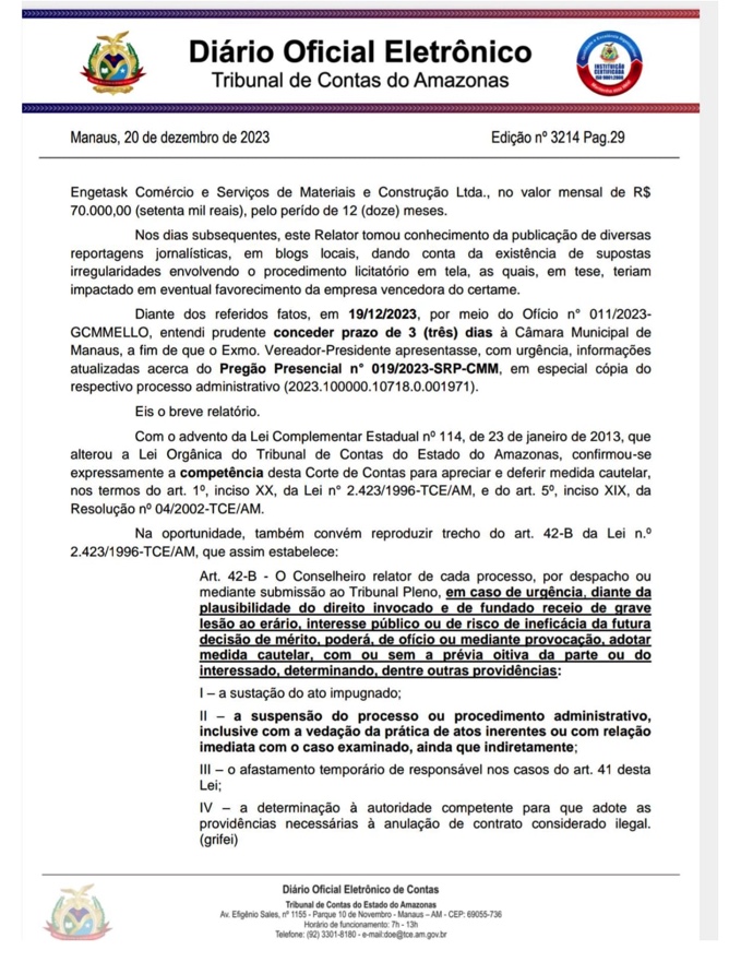 TCE-AM suspende licitação da CMM após denúncia de favorecimento à empresa Engetask