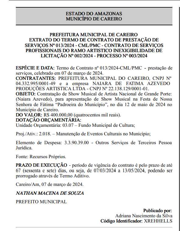 Amazonas – No último dia 7 de março, o prefeito Nathan Macena, de Careiro Castanho, assinou um contrato milionário para a contratação do show da cantora nacional Naiara Azevedo, que está programado para acontecer no dia 12 de maio, durante a Festa de Nossa Senhora de Fátima. O montante de R$ 400 mil foi destinado para esse evento, conforme publicação no Diário Oficial dos Municípios do Amazonas.
