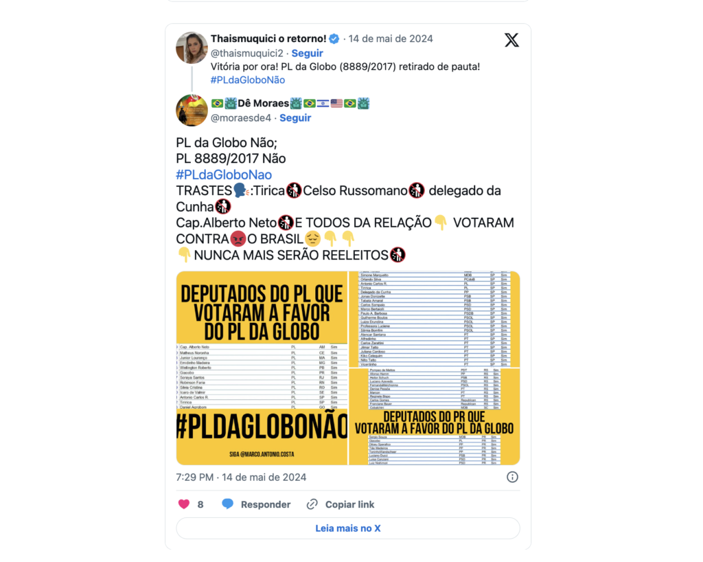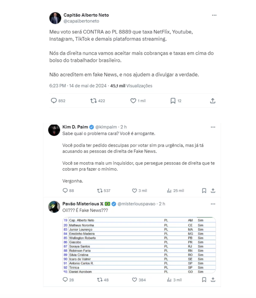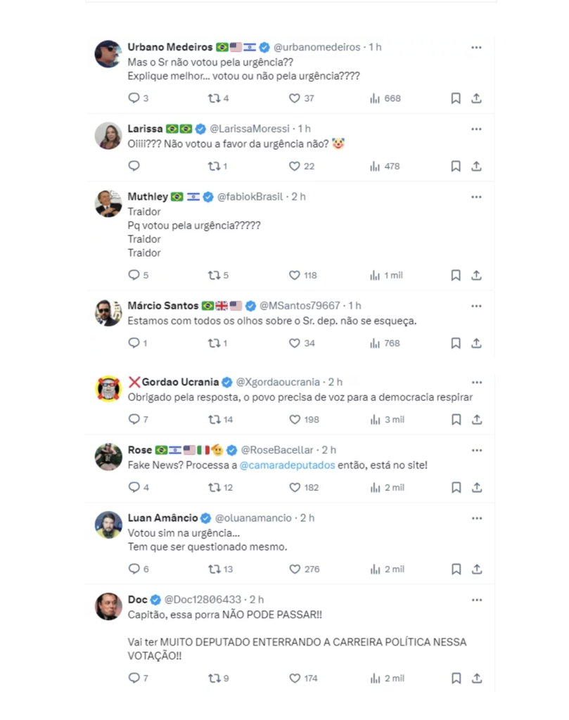 No entanto, mesmo com a justificativa, o deputado continuou a ser criticado. “Sabe qual o problema, cara? Você é arrogante. Você poderia ter pedido desculpas por votar sim para a urgência, mas já está acusando as pessoas de direita de fake news. Você se mostra mais um inquisidor, que persegue pessoas de direita que te cobram fazer o mínimo. Vergonha“, escreveu um internauta.