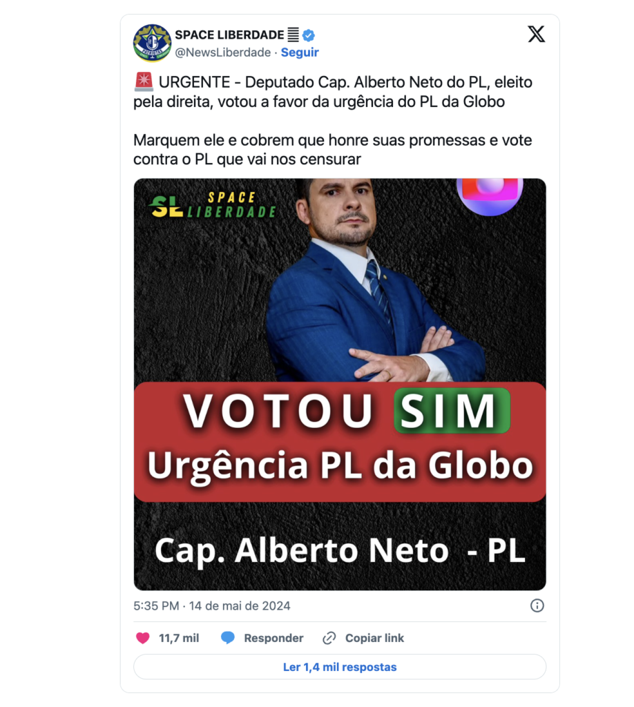 Alberto Neto foi apontado por diversos internautas como apoiador do PL após seu nome constar na lista dos que votaram a favor da urgência. Diante das críticas, ele se manifestou nas redes sociais contra o projeto e alegou que a informação era falsa.